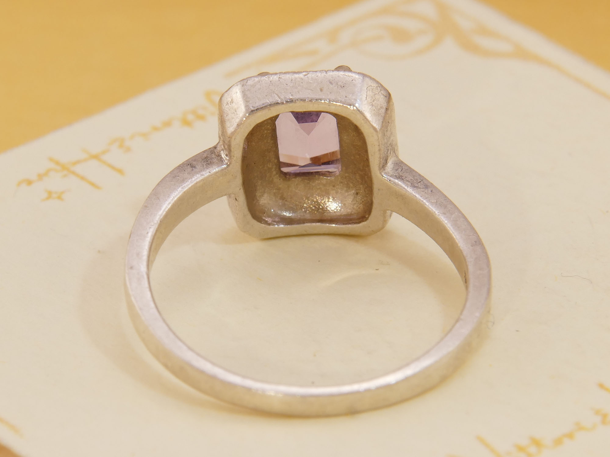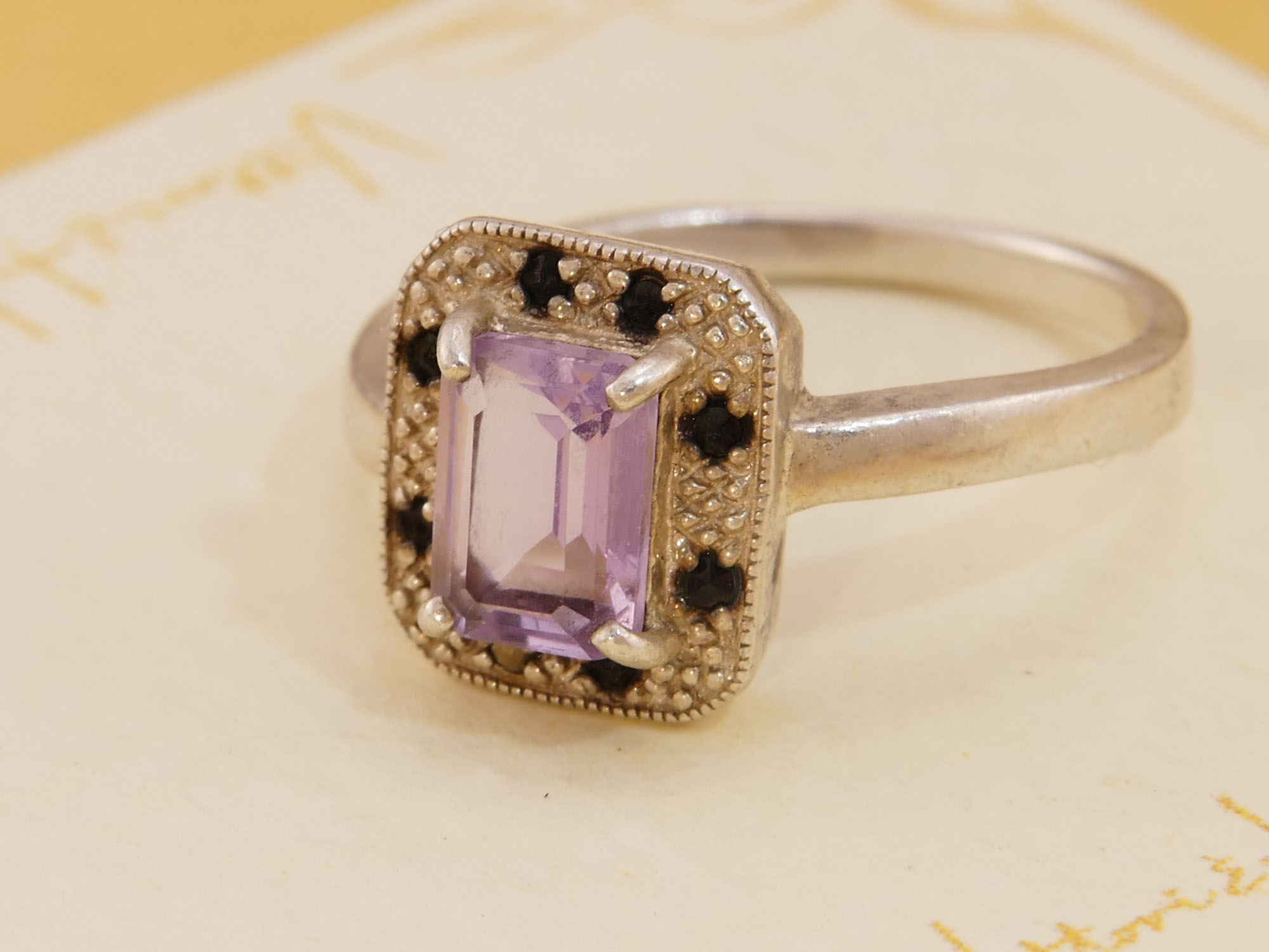 Vintage Art Deco style 1980s solid silver halo ring featuring a rare Rose de France Amethyst with a rectangular step cut, surrounded by dark marcasite accents.