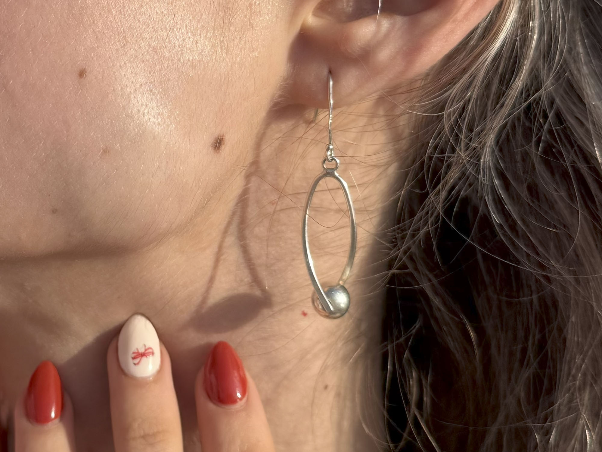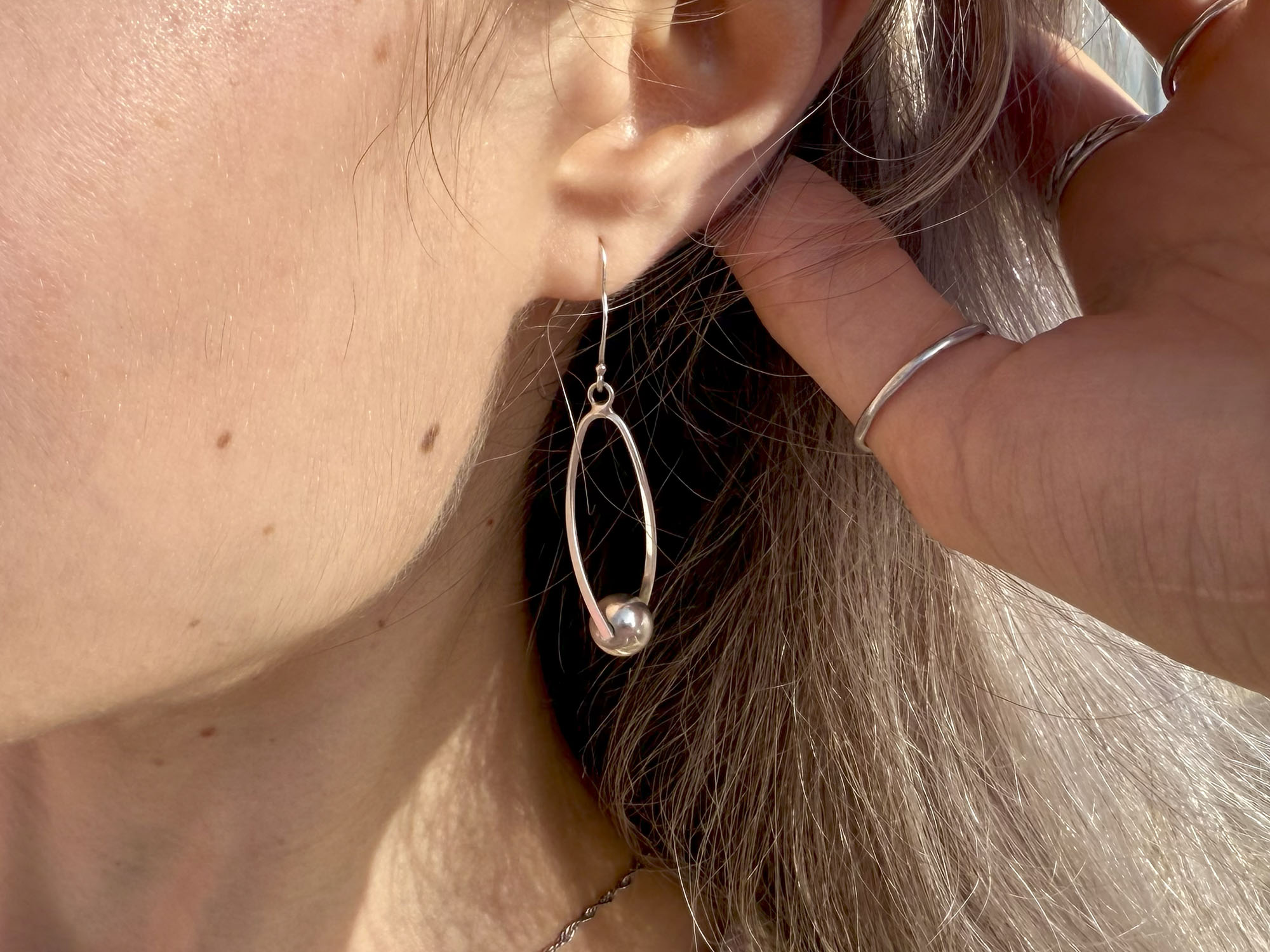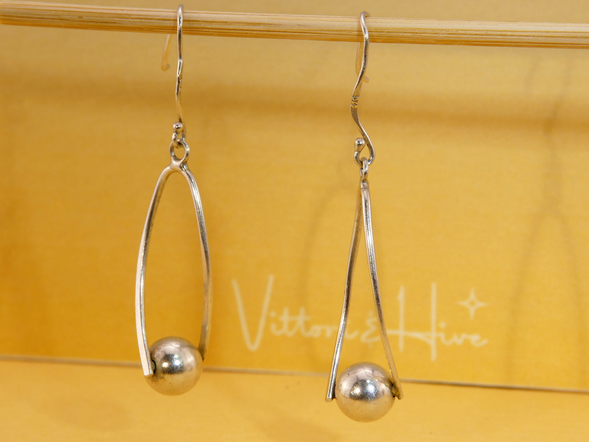 These sculptural earrings feature a fluid, elongated loop with a polished silver sphere suspended at its centre. Designed for movement, the sleek oval frame swings gently from a simple ear wire hook. Stamped 925, these are a fine example of mid-century design minimalism.