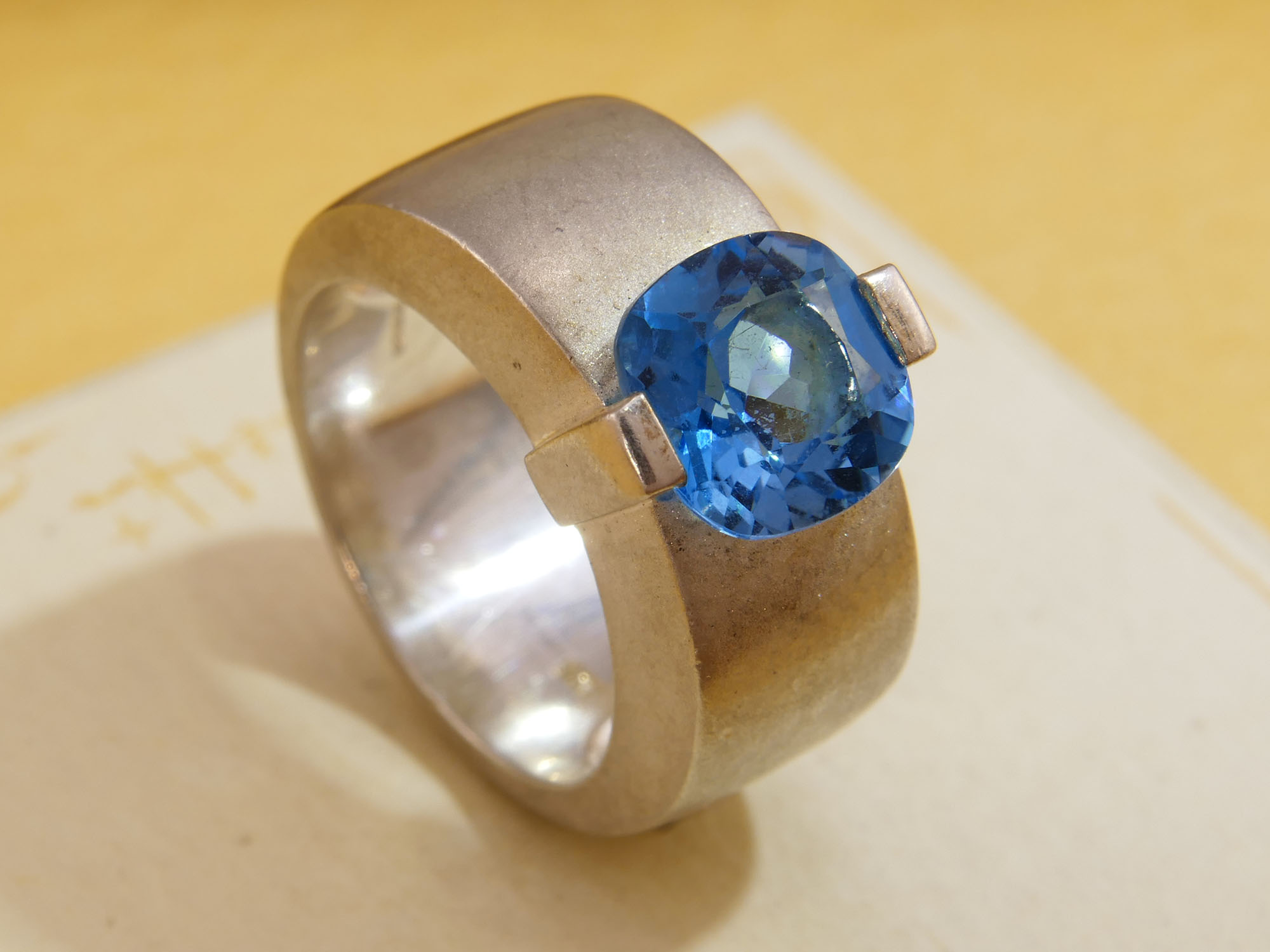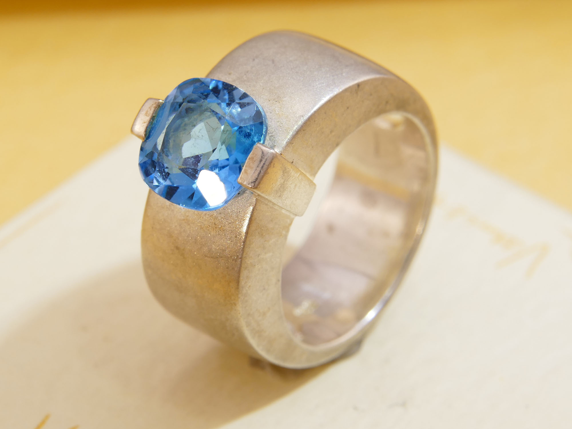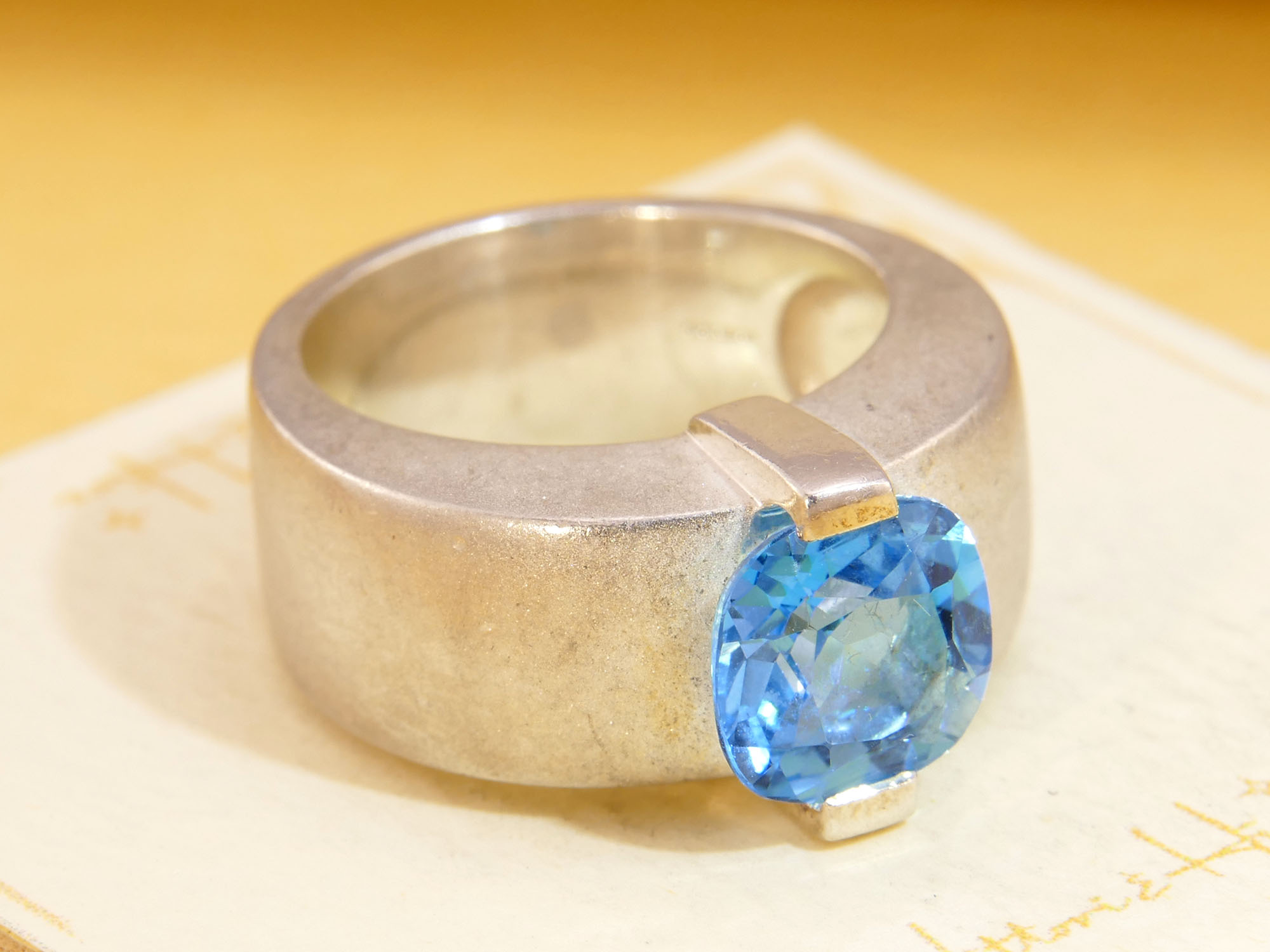 Modernist Blue Topaz Thick Satin Silver Band Ring Hallmarked 2007