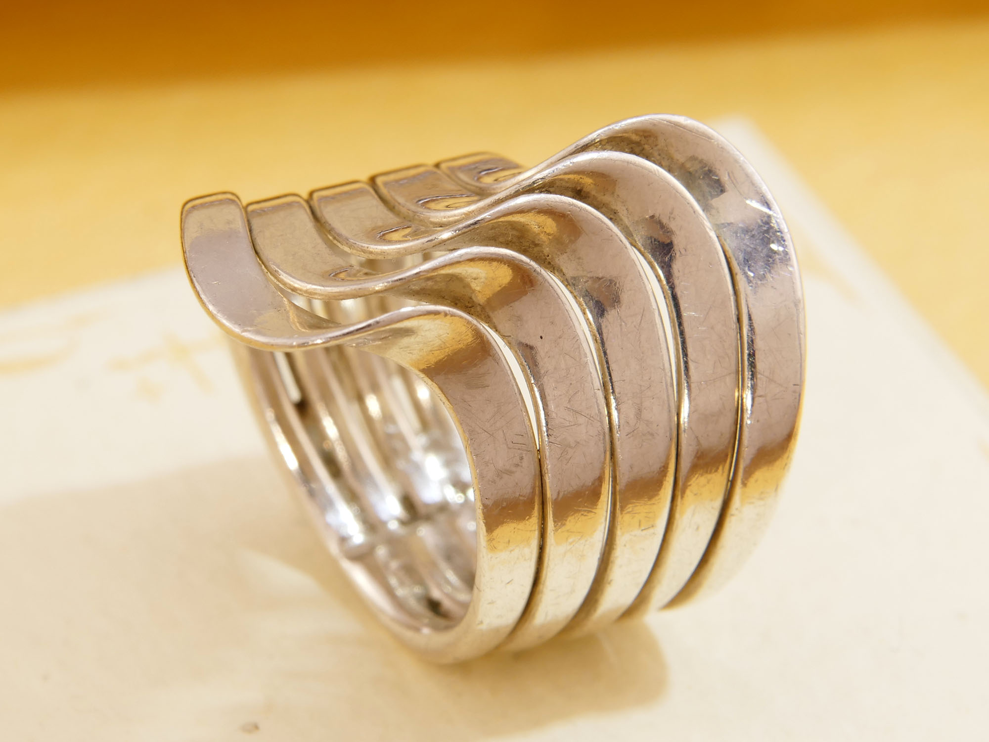 Striking and sculptural, this vintage sterling silver ring features a bold Modernist wave design that mimics five stacked bands. Despite its chunky appearance, the ring is surprisingly comfortable and easy to wear, making it an ideal everyday statement piece.