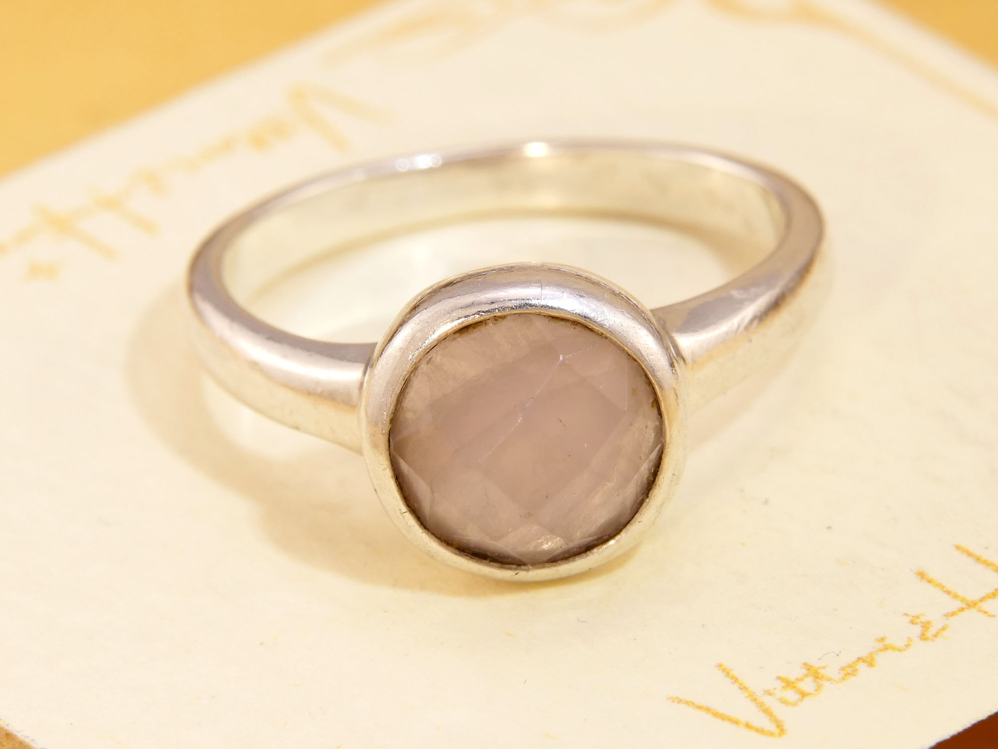 This vintage sterling silver ring features a natural Rose Quartz in a soft pink tone. The rose-cut pink gemstone shimmers subtly under light.