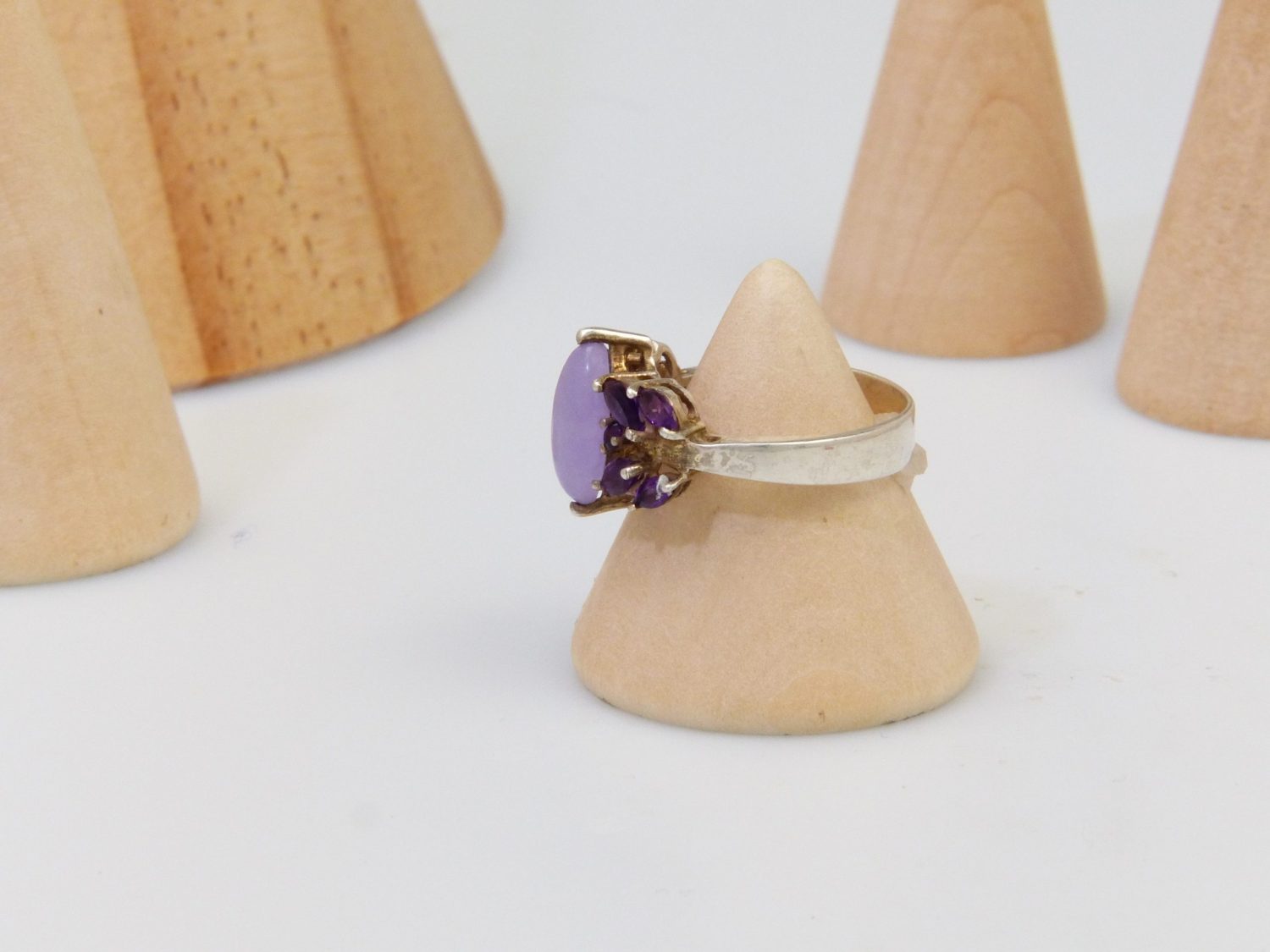 Eye catching silver ring with an opaque natural Lavender Amethyst polished to an oval cabochon. This is surrounded by 8 clear purple Amethyst, of a very good colour.