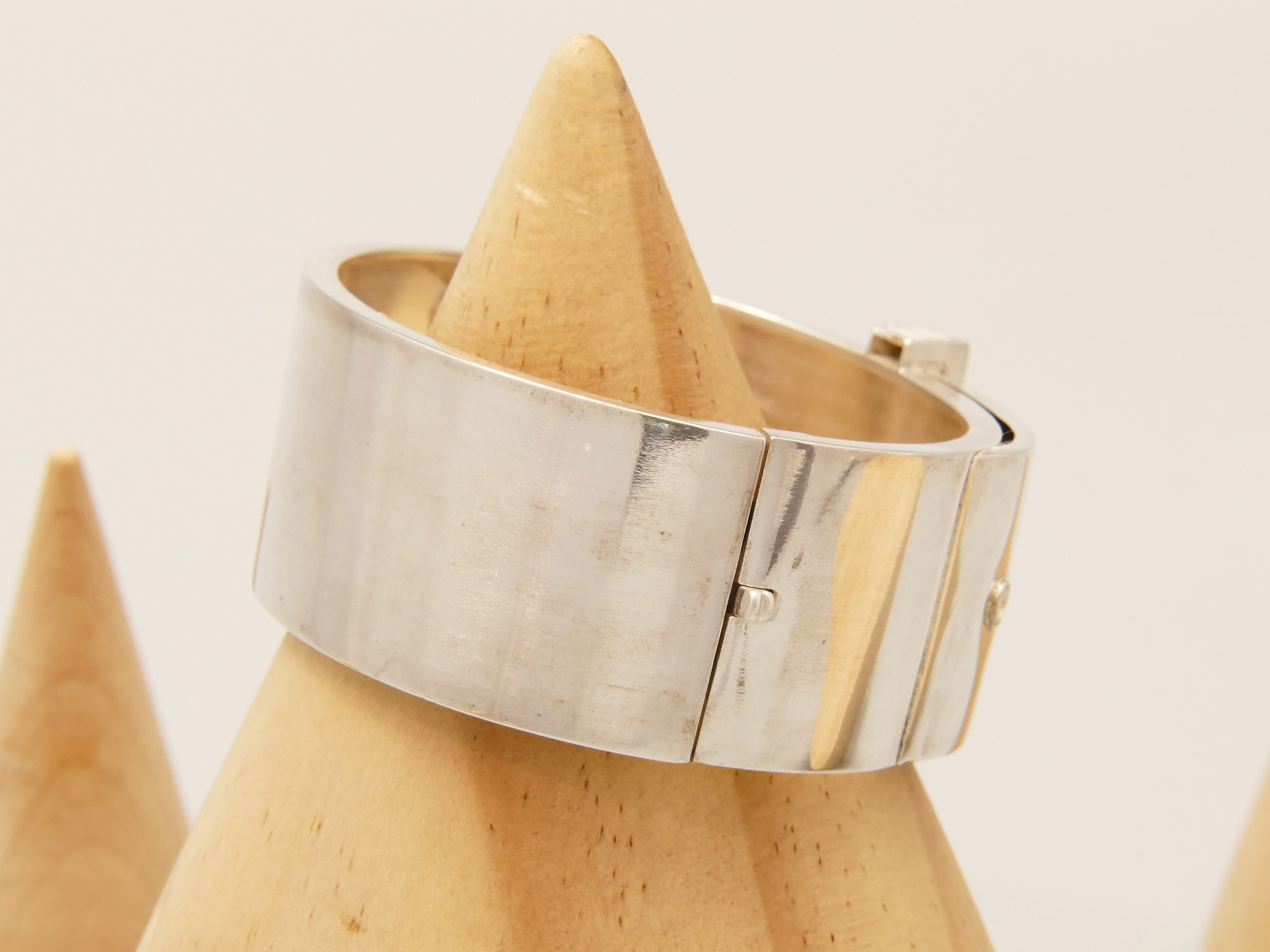 This sterling silver bangle has a highly polished finish. Further, it is in exceptional condition & it just sparkles. The band is very wide.
