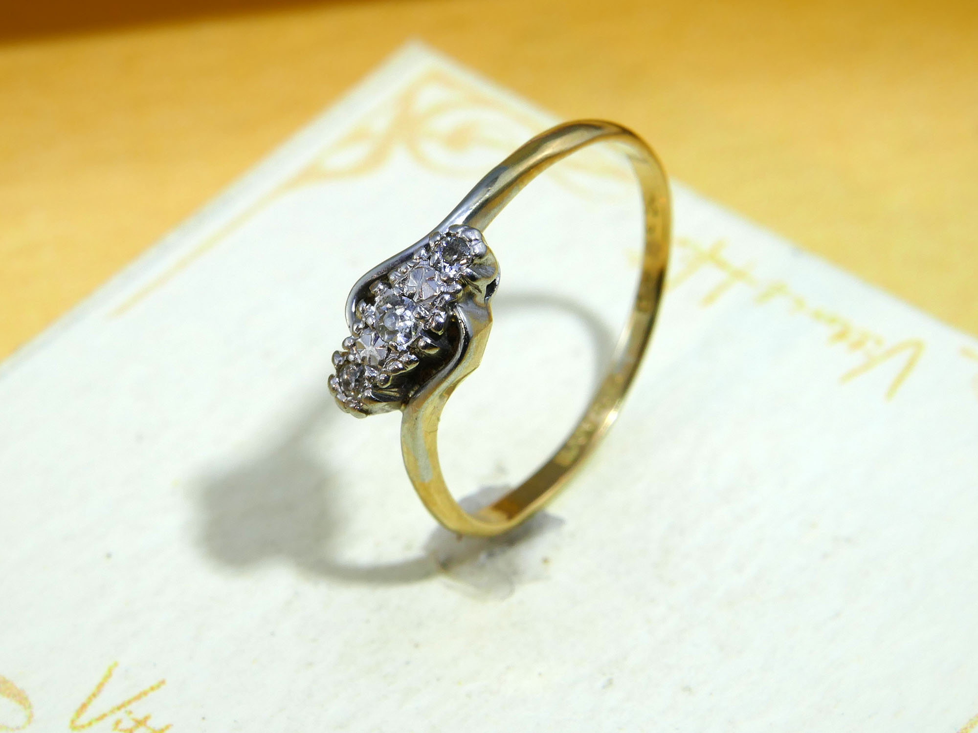 This classic mid-century 18ct yellow gold ring features a shimmering crossover diamond trilogy. Estimated from the 1950s, the design pairs a warm gold band with a white gold illusion setting to enhance the brilliance of the bright, eye-catching diamonds.