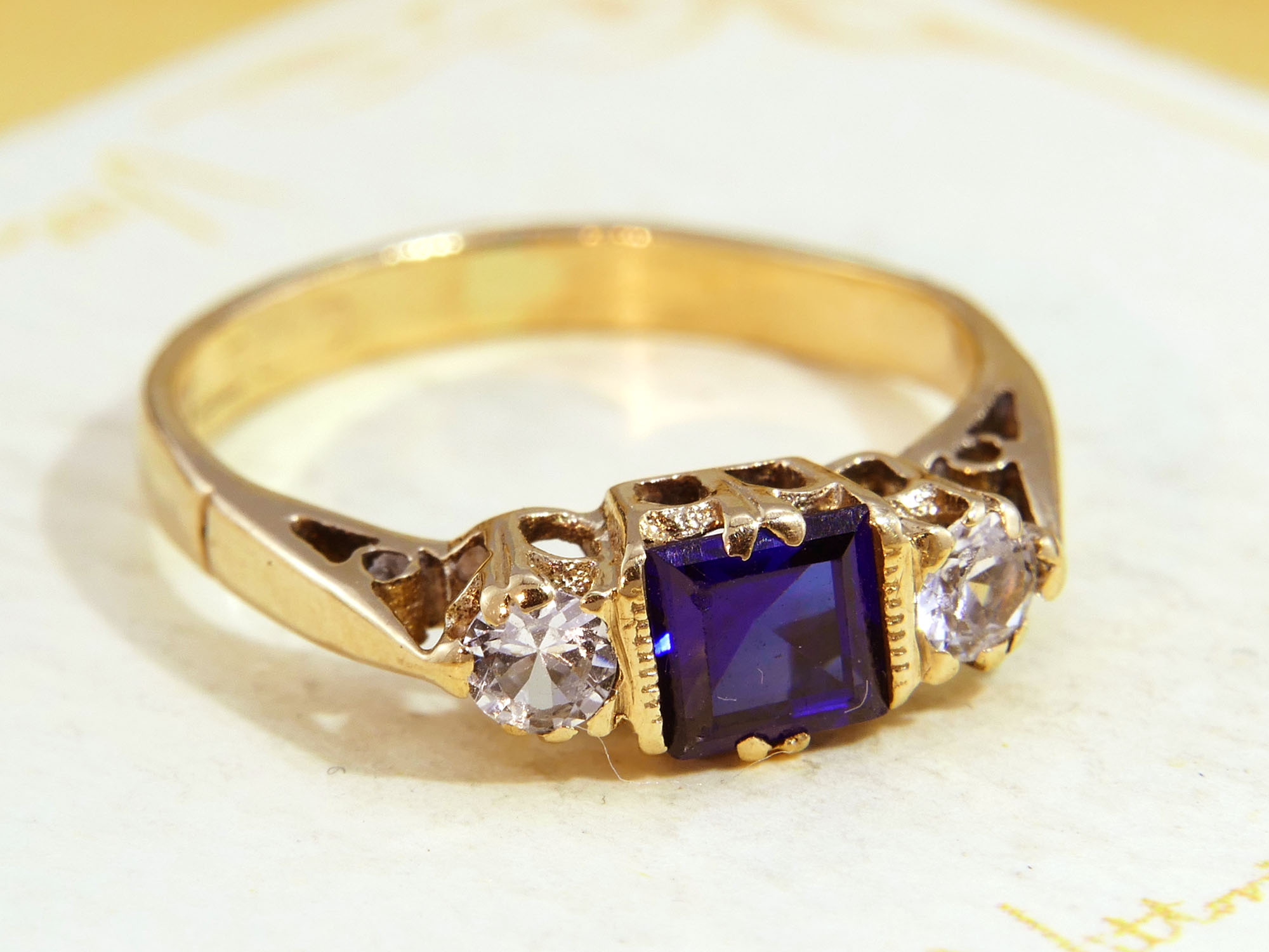 This vintage 9ct yellow gold ring showcases a vivid square-cut Blue Sapphire flanked by two White Sapphires in a classic 3-stone design. The bold geometry & vibrant colour are enhanced by delicate claw settings & a light-enhancing open gallery.