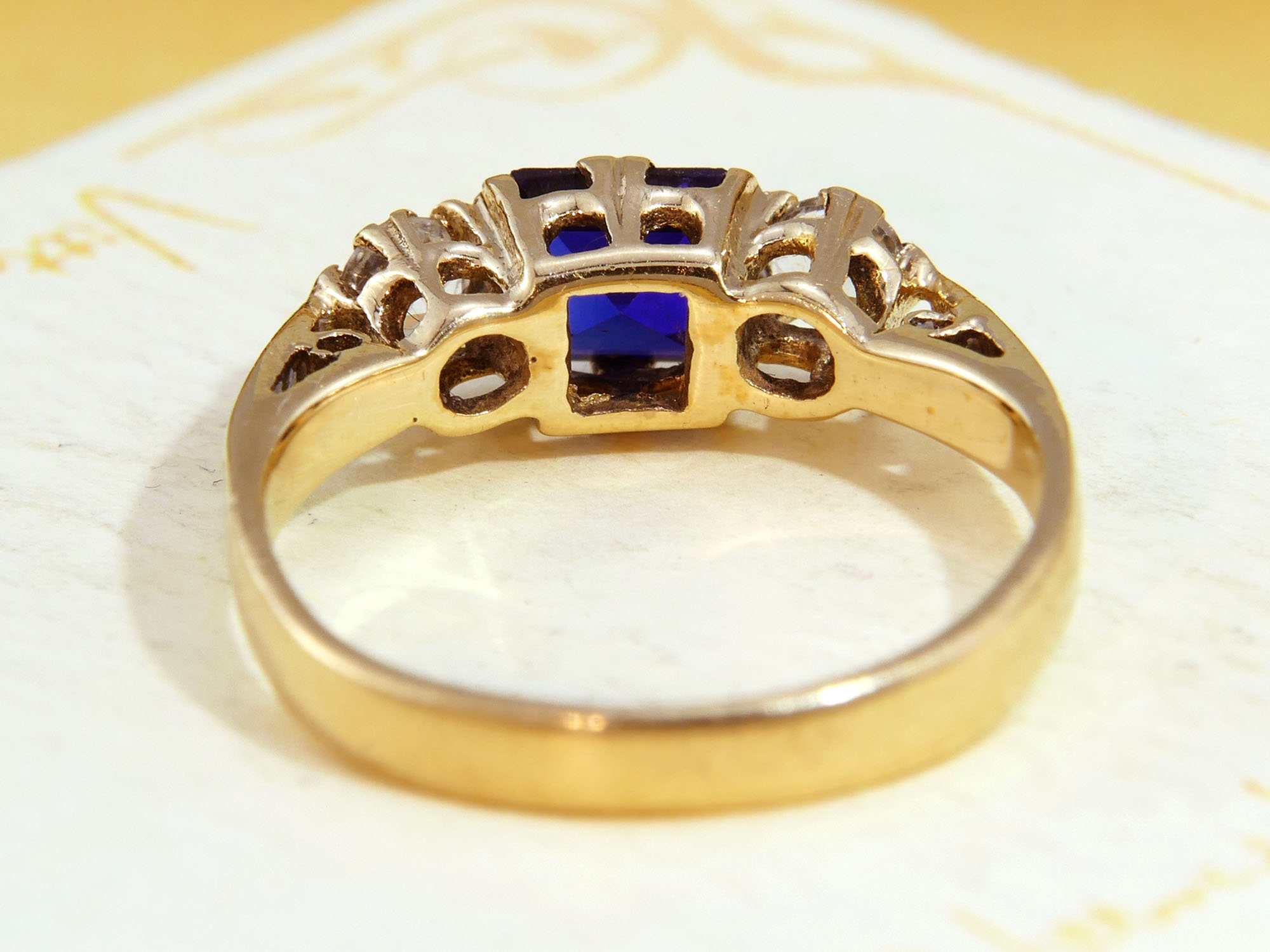This vintage ring is in good condition. The hallmarks are partially worn. One corner of the sapphire shows minor wear, and a claw is slightly bent—both signs of age but nothing that affects wear.