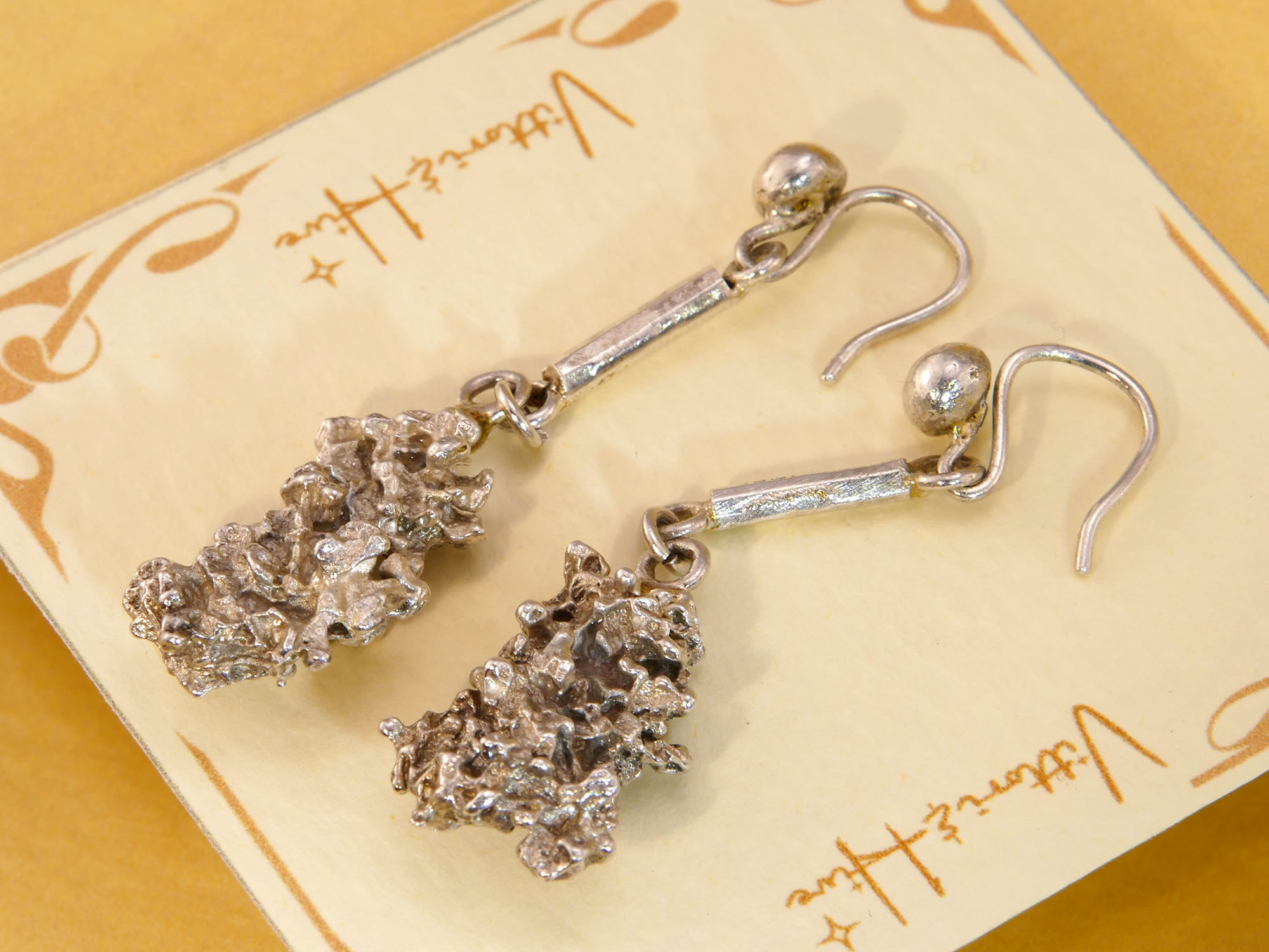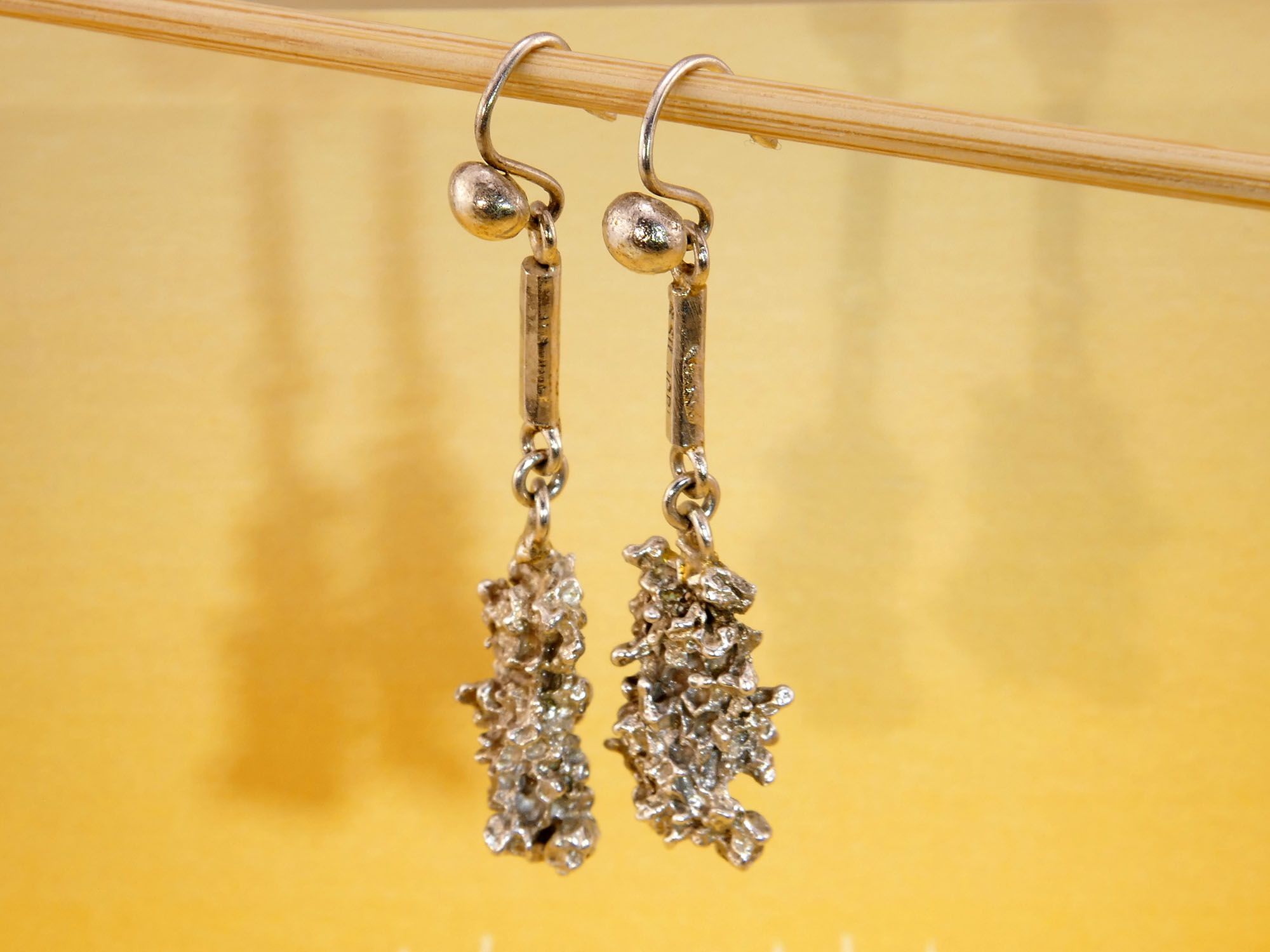Statement molten-form drop earrings in solid silver, stamped S.SILVER with a maker’s mark for JOBE. These weighty 1970s Brutalist earrings feature a naturalistic silver ‘specimen’ nugget suspended from a thick bar and French hook ear wires.