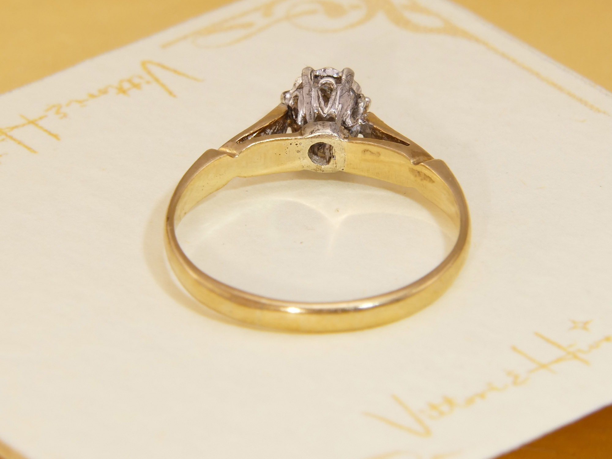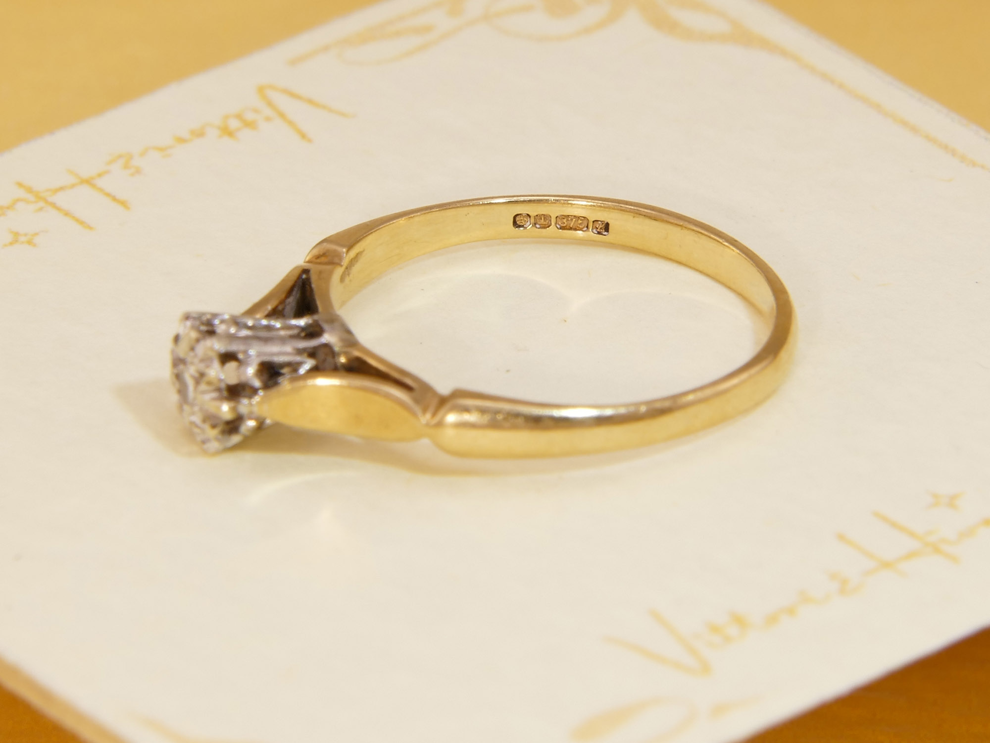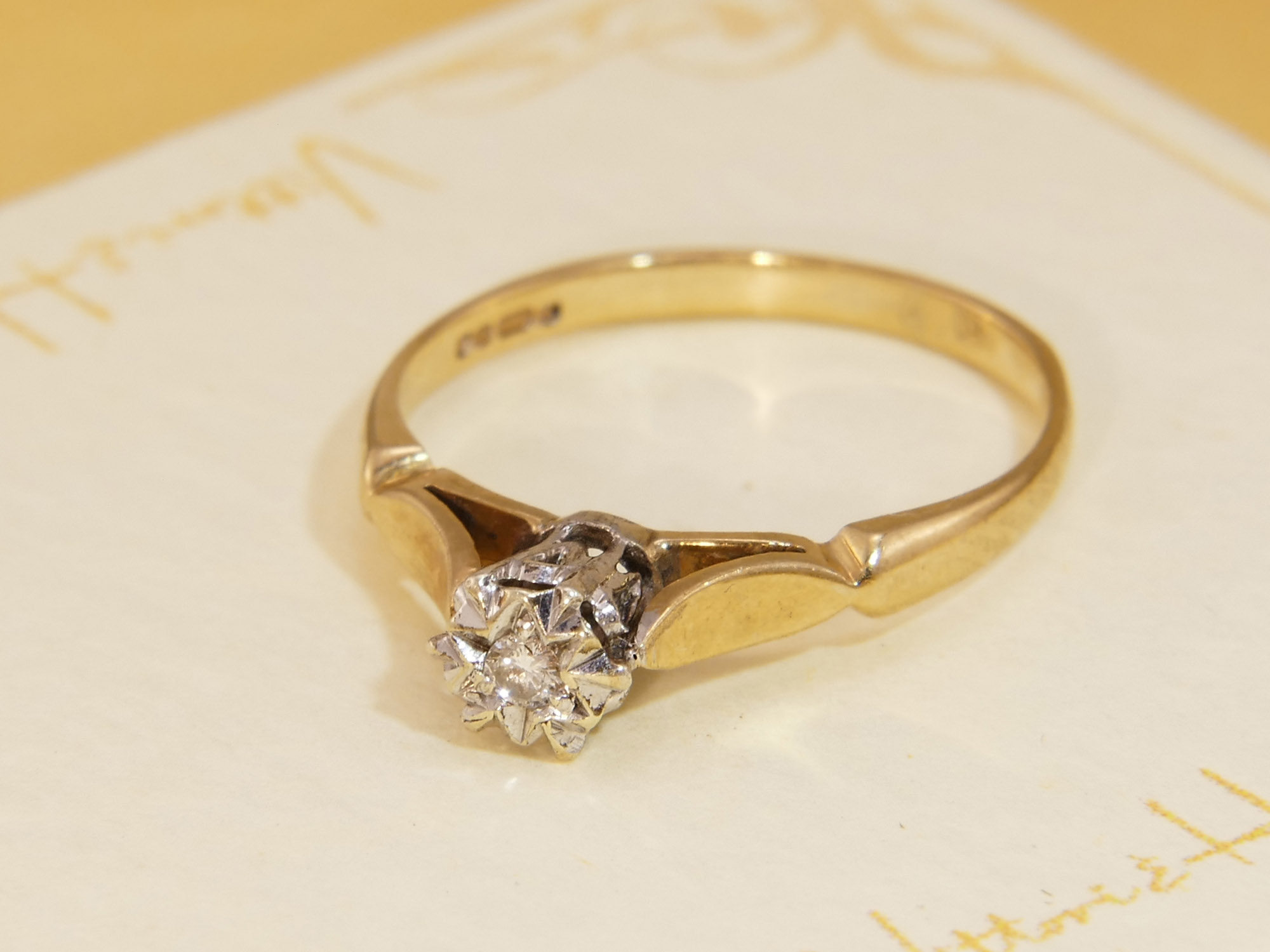 Vintage 1985 9ct yellow gold ring with full English hallmarks, featuring a bright round Diamond in a white gold star-shaped illusion setting for added brilliance.