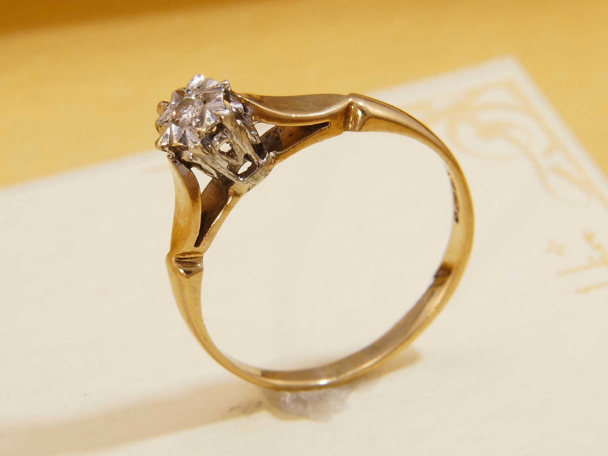 This vintage gold ring centres on a 2.5mm round brilliant cut Diamond, elevated in a raised gallery to let in maximum light. The white gold illusion setting enhances the stone’s size & sparkle, creating a classic solitaire look with extra flair.