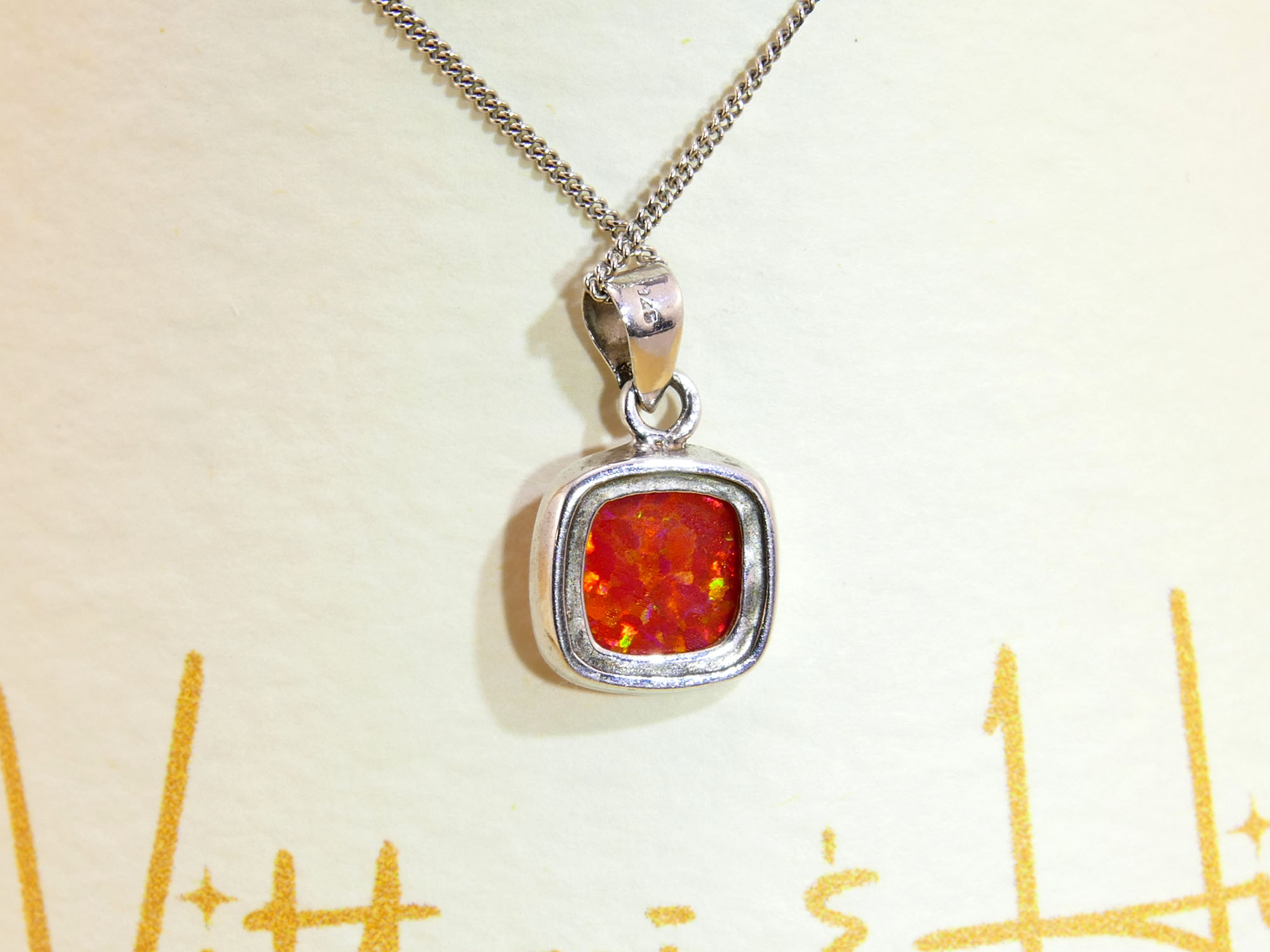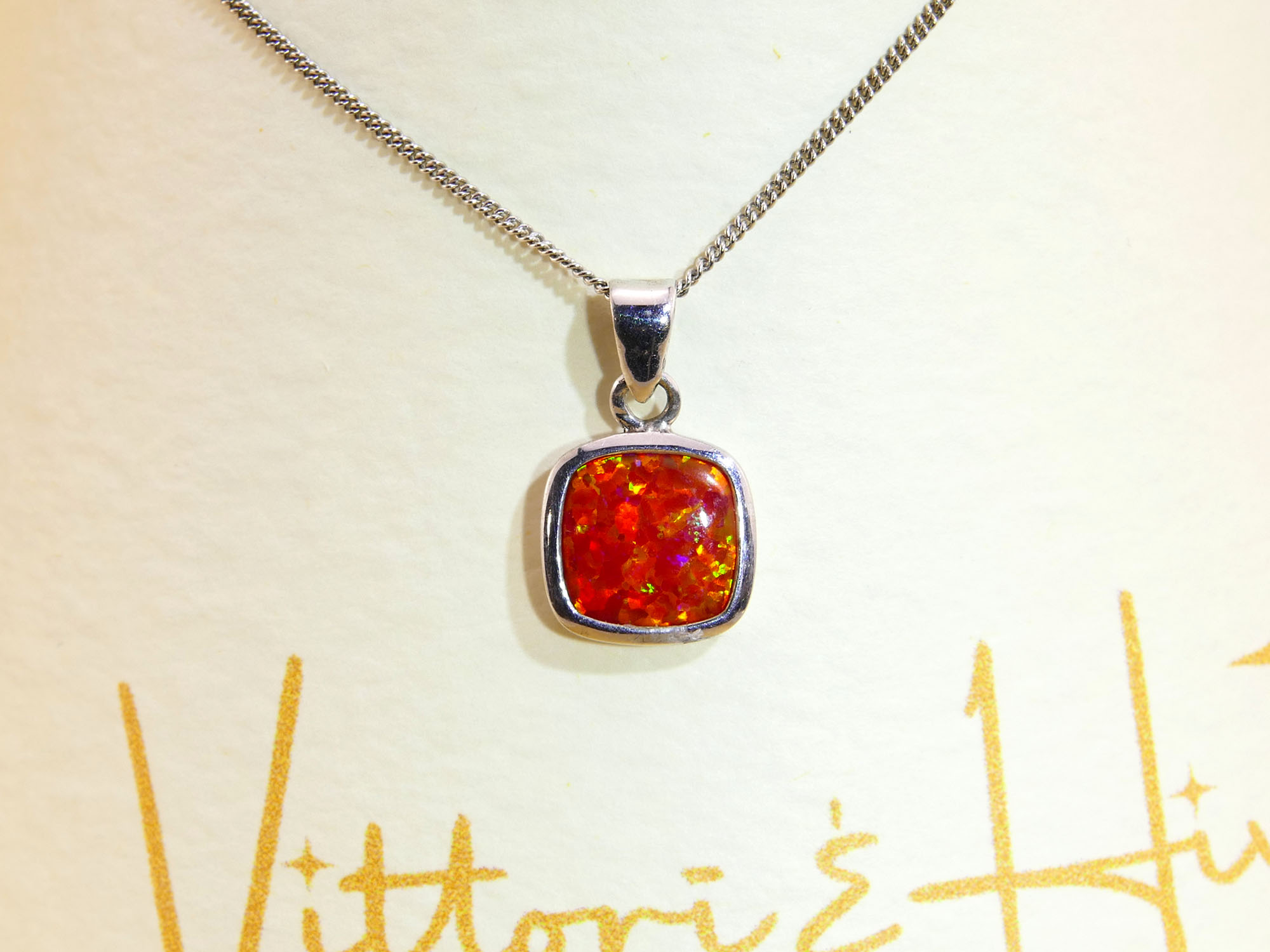 This vibrant vintage sterling silver necklace, likely dating from the 1990s, features a mesmerising square cabochon Fire Opal. The gemstone is a rich, fiery orange, filled with vivid yellow and green flashes that catch the light beautifully. It is securely housed in a smooth, tactile bezel setting that emphasises its clean, minimalist aesthetic.