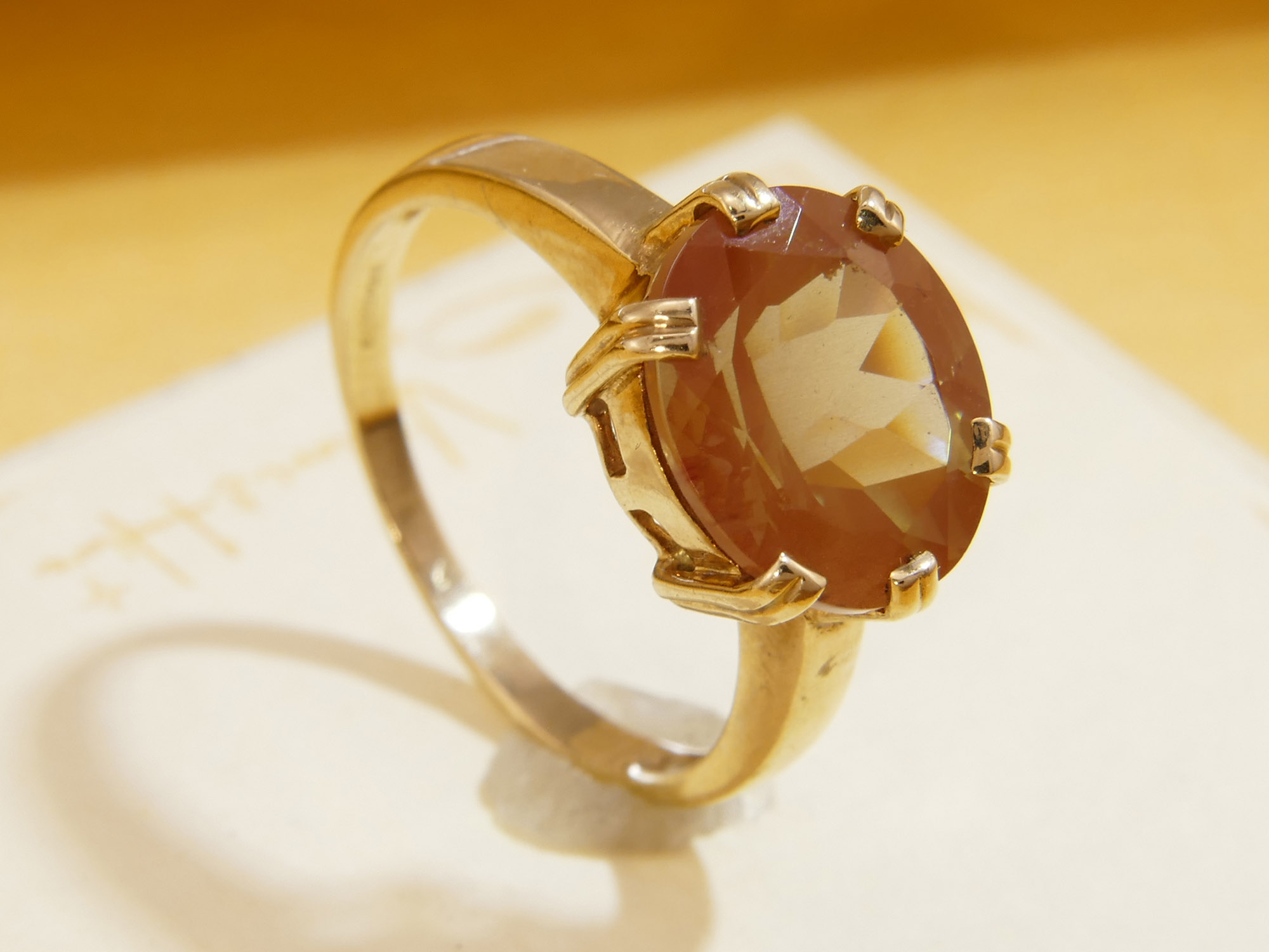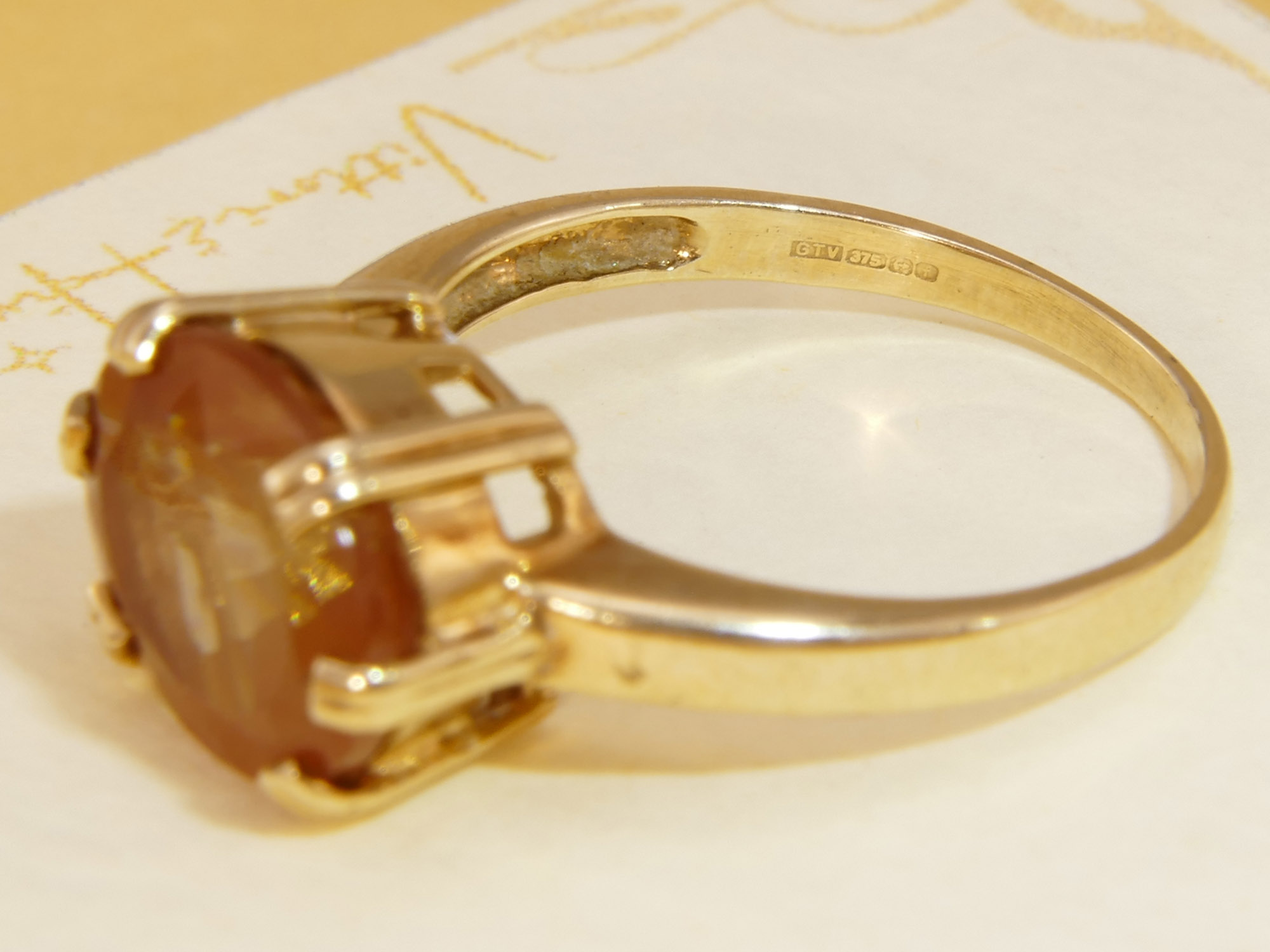 Vintage 2005 9ct yellow heavy gold ring with Birmingham hallmarks, featuring a rare oval Andesine Feldspar gemstone in glowing peach-gold with green iridescence—chunky, solid gold setting & bold vintage presence.