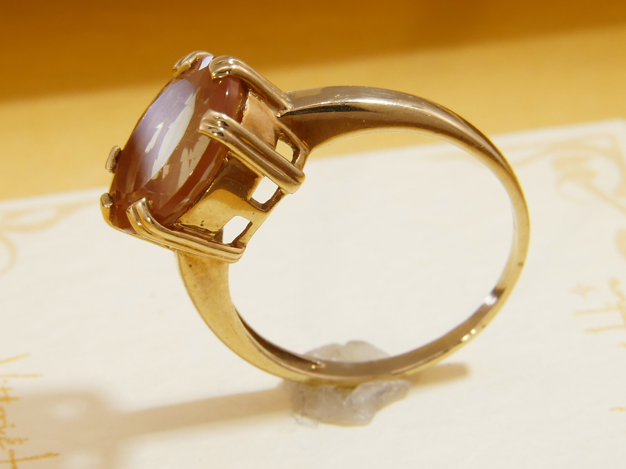 Rare Iridescent Peach Andesine Ring in Chunky 9ct Yellow Gold Hallmarked 2005