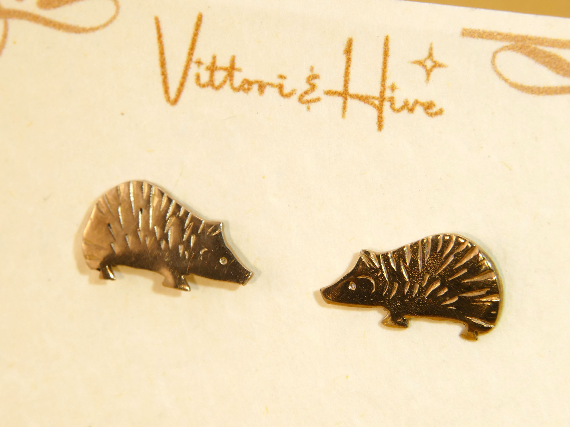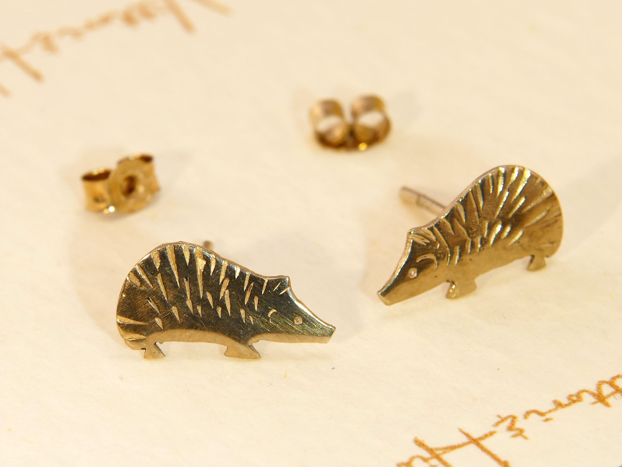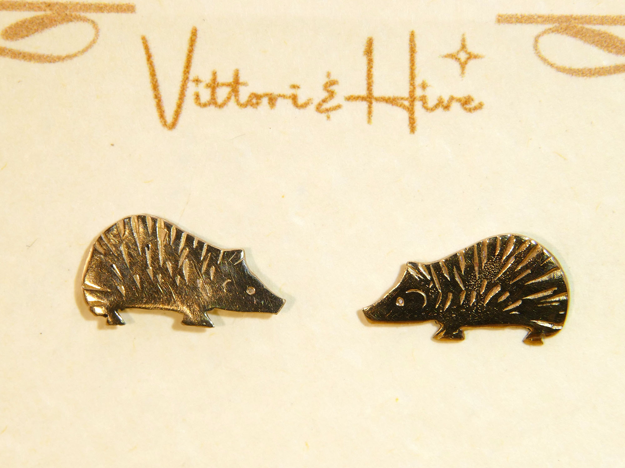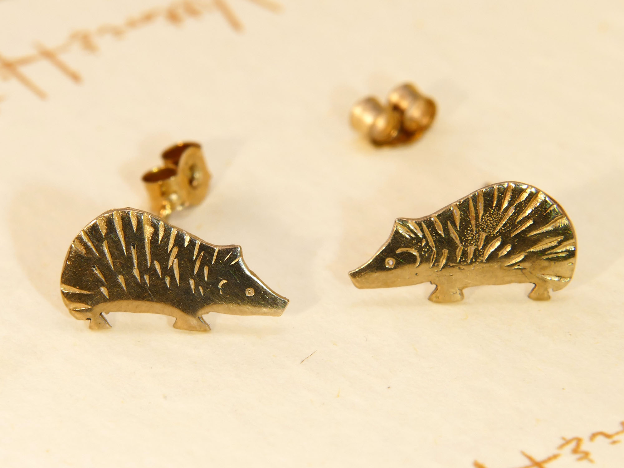 Charming vintage hedgehog stud earrings in solid 9ct yellow gold, each one hand-cut from sheet gold & engraved with adorable detailing. Stamped 9CT and made in England, these 1960s studs are a quirky & collectable pair full of personality.