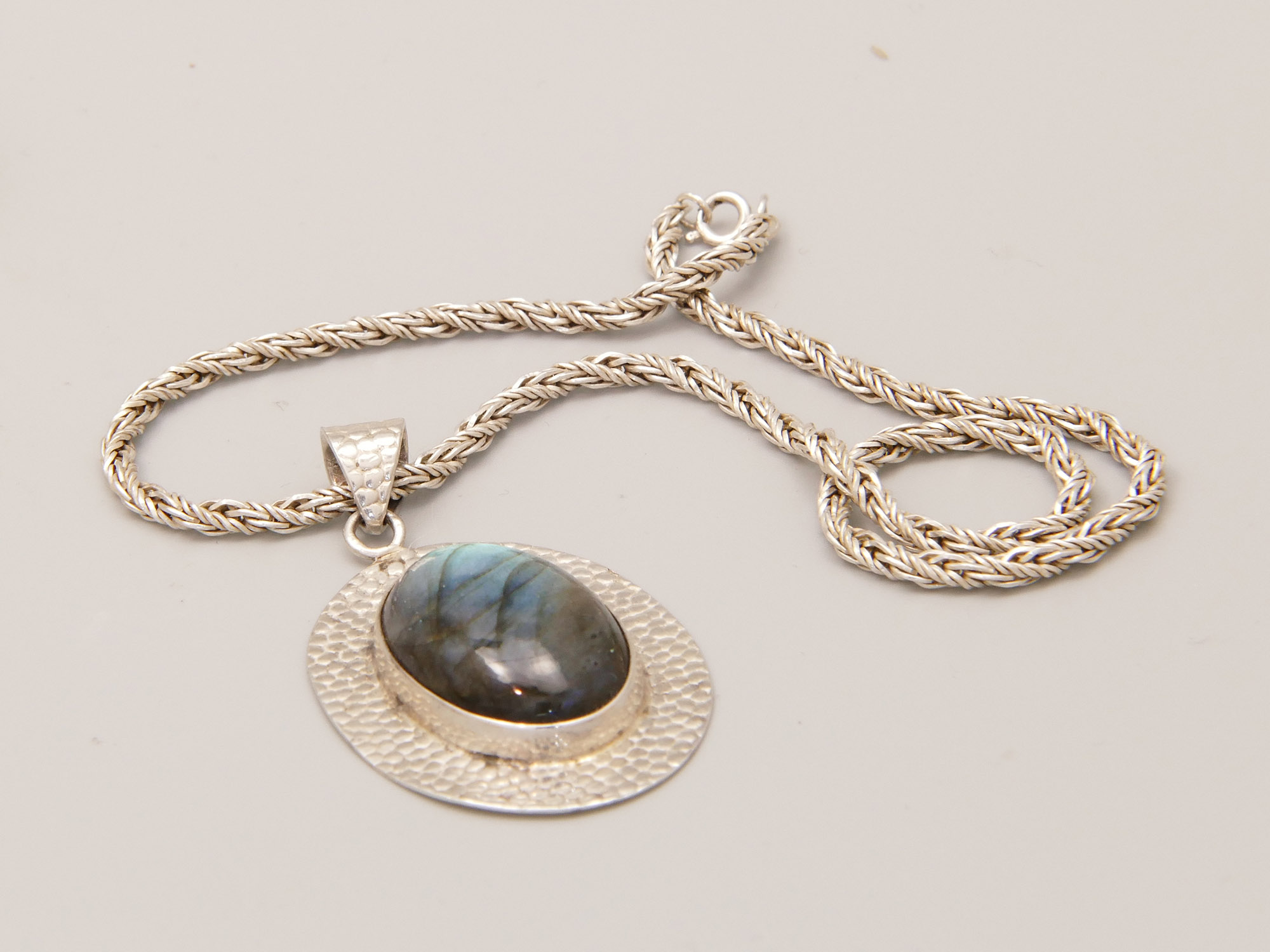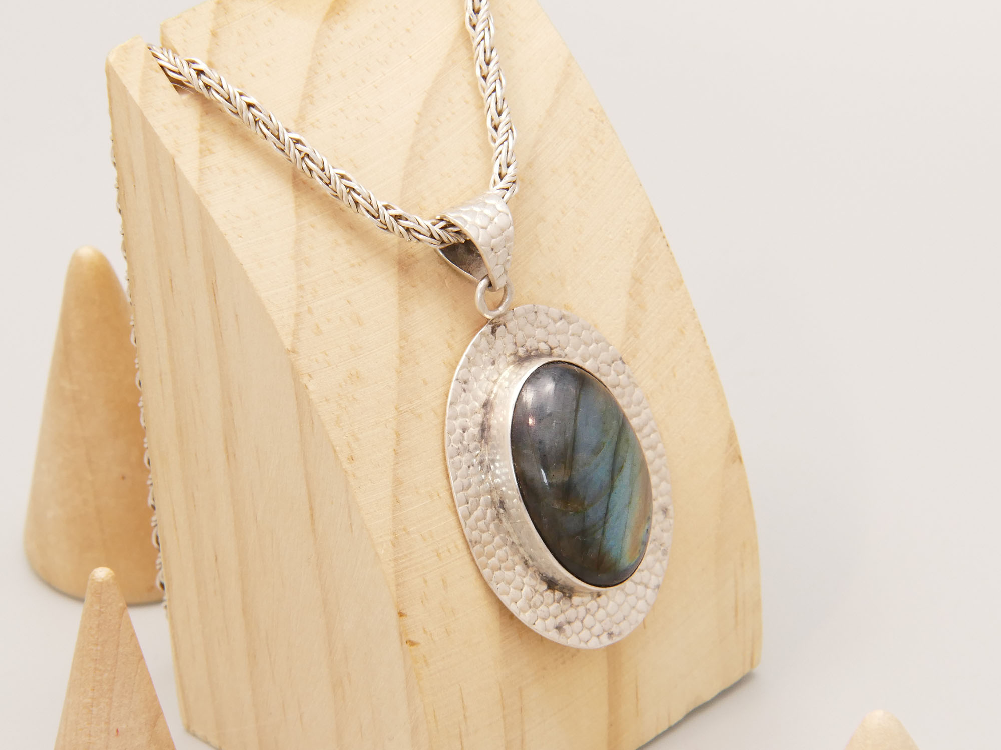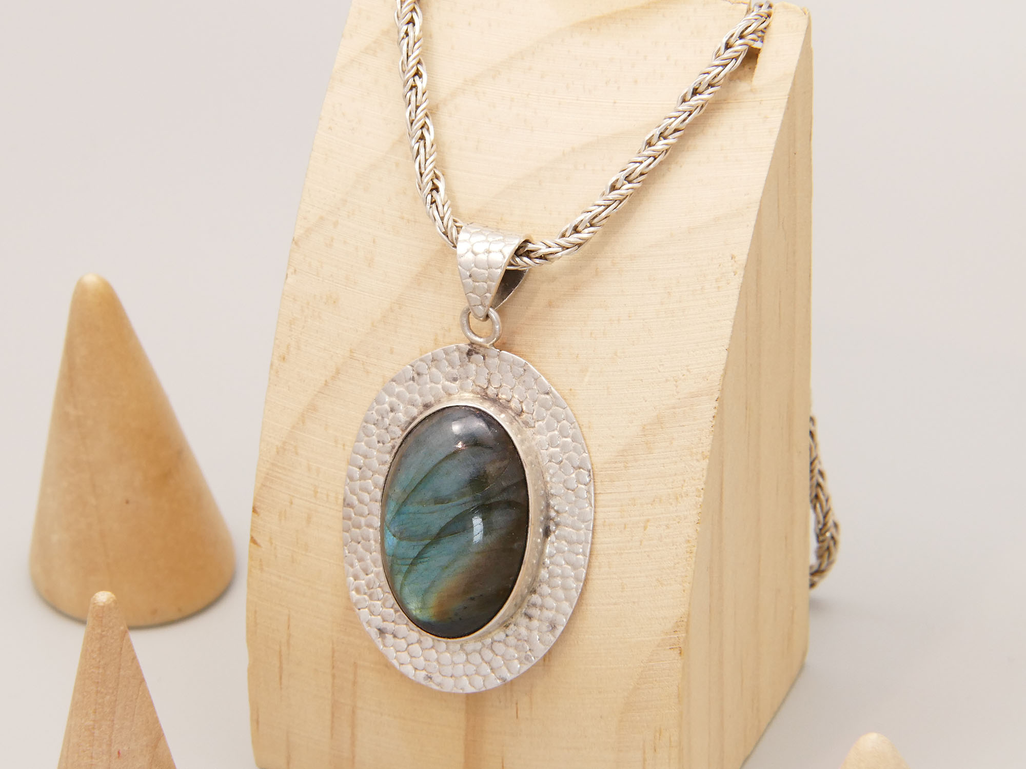 The Labradorite is bezel set in a textured silver frame. The pendant bale is also textured.