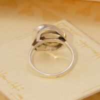 The Moonstone is round cabochon cut, 10.4mm in diameter, and exhibits a classic silvery chatoyancy, almost tiger’s eye-like, enhanced by fine needle-like inclusions within the gem. The contrast between the warm white Moonstone and the bright silver is both soothing and striking.