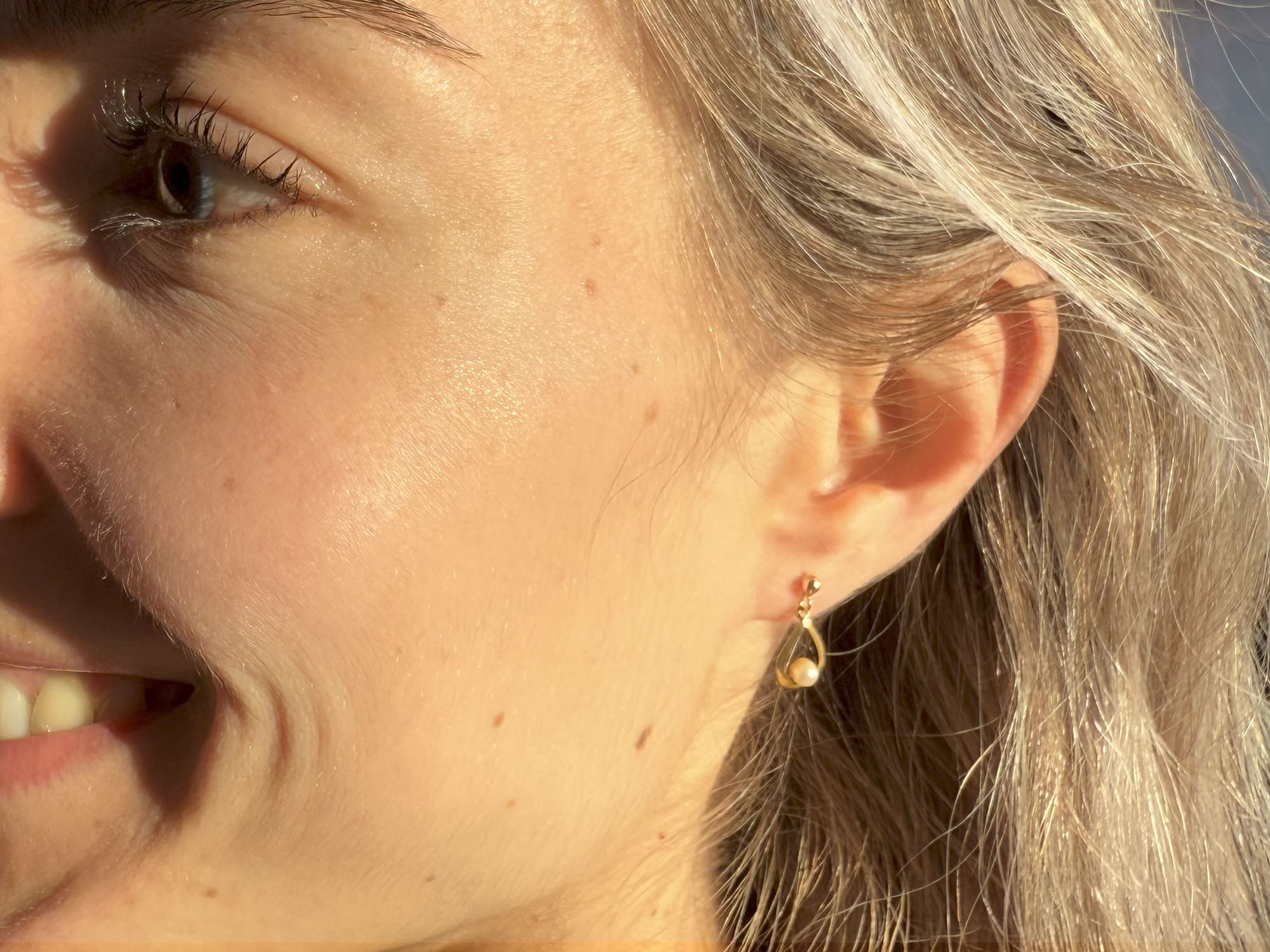 Acid-tested as solid 9ct gold, this 1980s design blends minimal elegance with soft curves. Each earring holds a white pearl with lovely lustre and subtle iridescence, cradled at the base of the open drop.