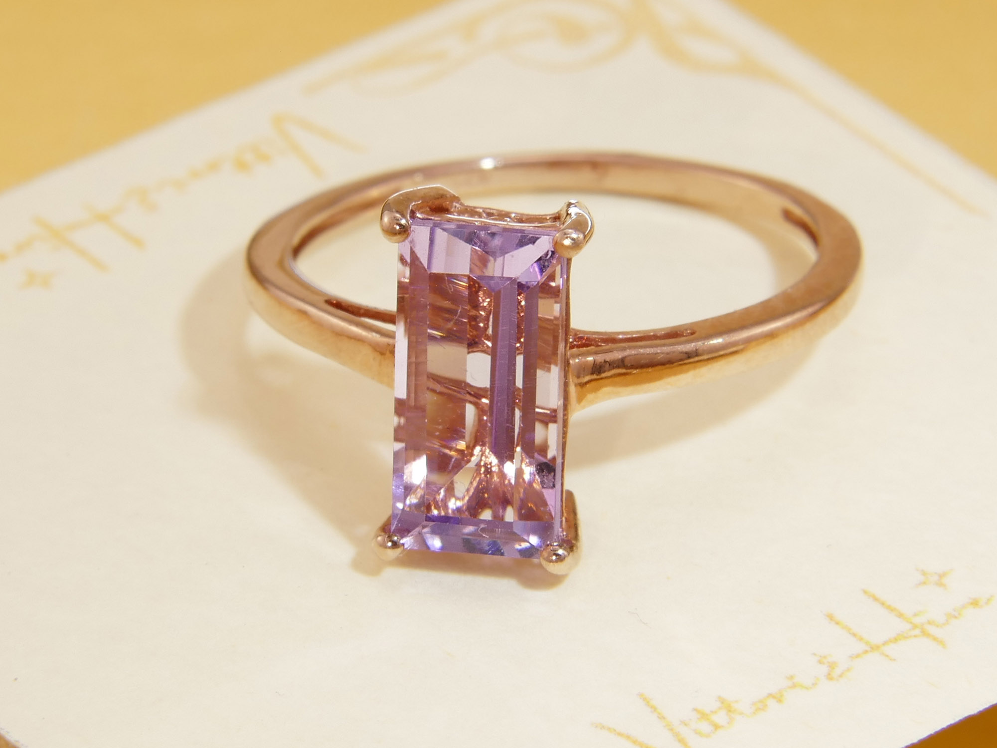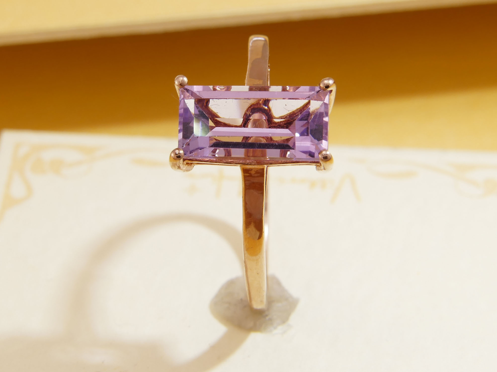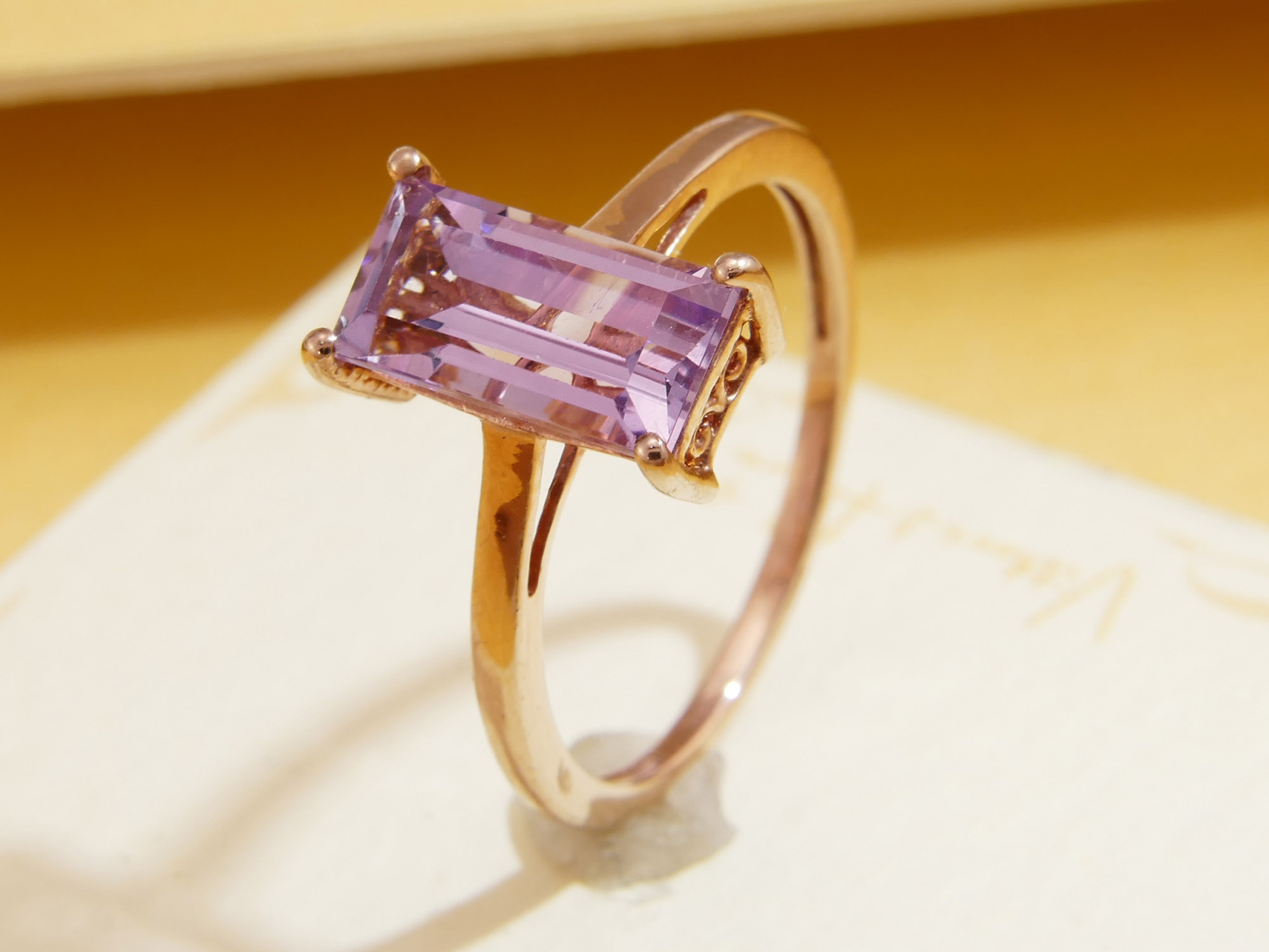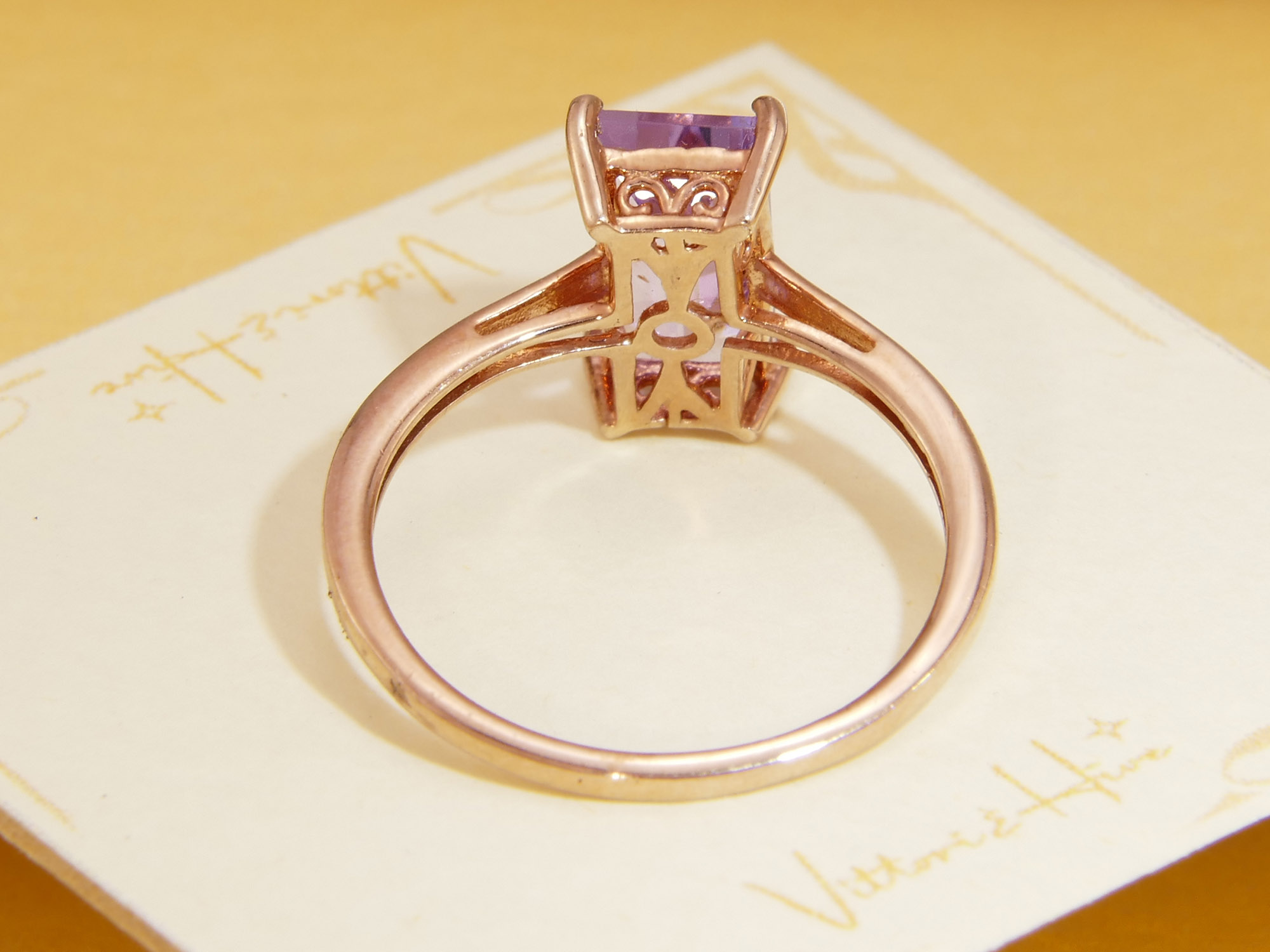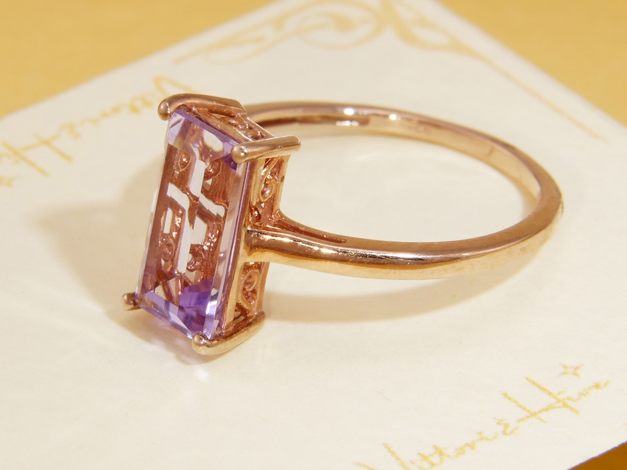 Vintage rose gold plated silver ring featuring a baguette-cut Rose de France Amethyst in a delicate claw setting with scrollwork detail—soft lilac hue, 2.1ct gemstone & elegant vintage style.
