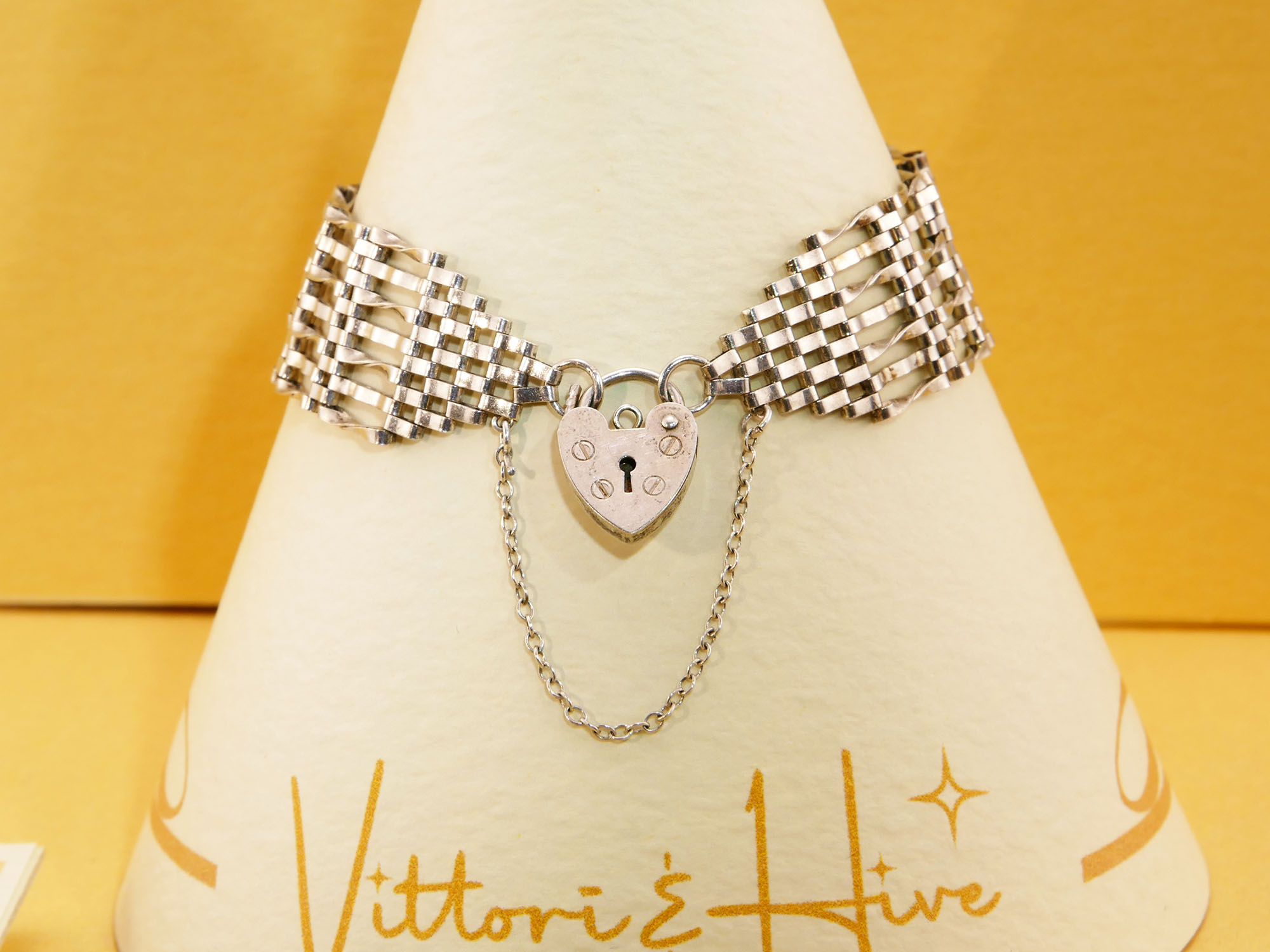 This substantial vintage sterling silver gate bracelet is a classic example of late 1980s craftsmanship. Hallmarked in London in 1989 with the maker’s mark “ASJ” for Alistair Stewart Jewellers, it features a sophisticated 7-bar design with fancy twisted links. The bracelet is secured by a traditional heart-shaped padlock catch—also fully hallmarked—and includes an intact safety chain for added security.