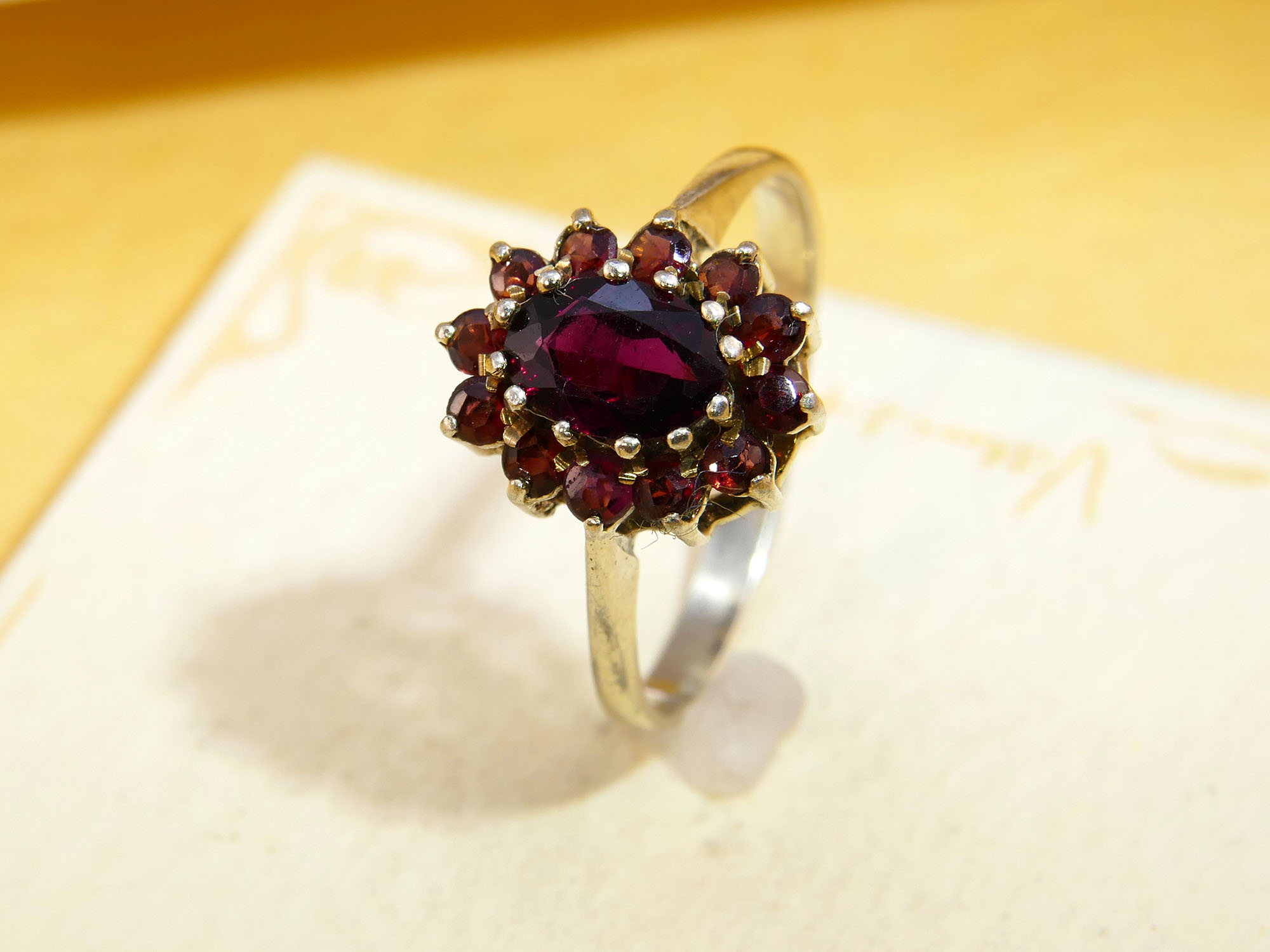 ⭐ Garnet cluster: 7.2mm x 5.4mm (central stone); 2mm (halo stones)