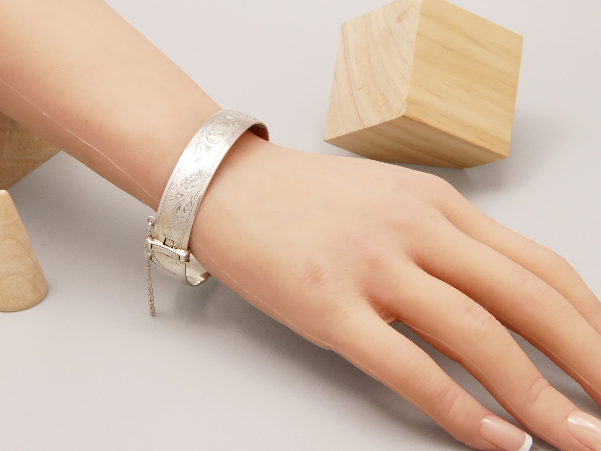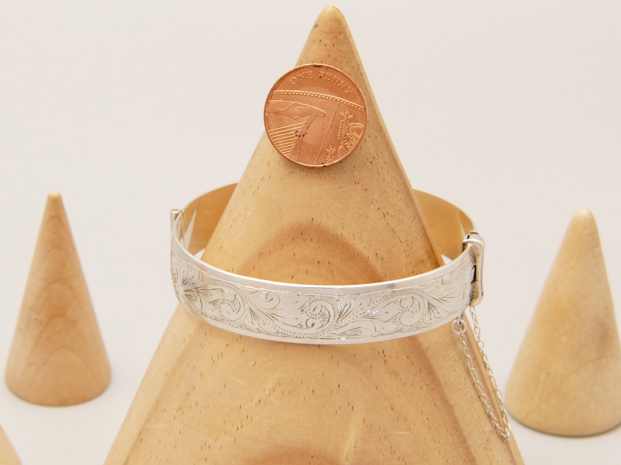 There is a safety chain just in case. There is floral engraving to the front of the bangle.