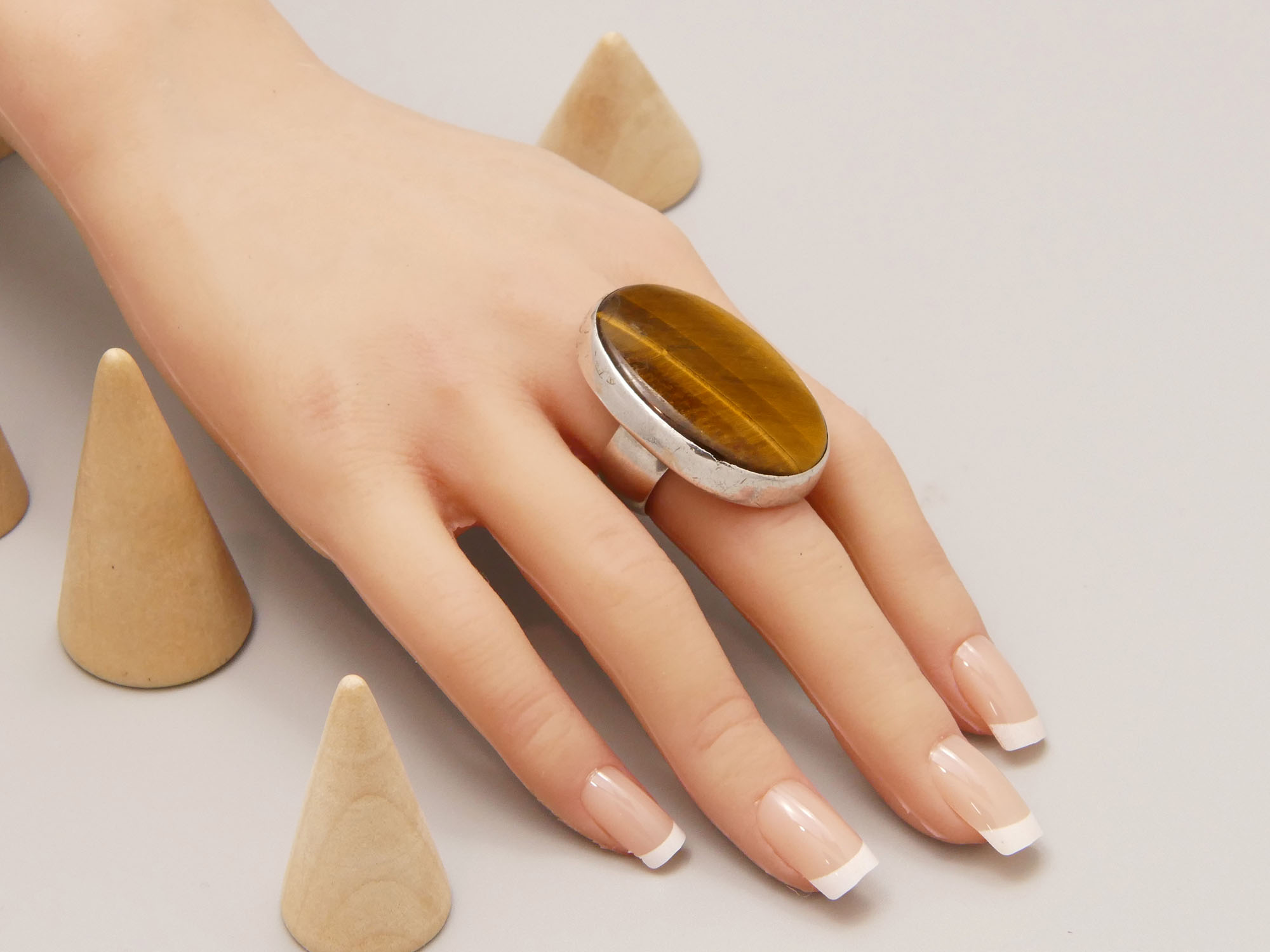 An outstanding 1970s statement ring designed by Wally Morgan, this bold vintage piece features an exceptionally large oval cabochon Tigers Eye, bezel set into a thick, solid sterling silver mount. Handmade and substantial, this ring embodies the dramatic retro styling of the period.