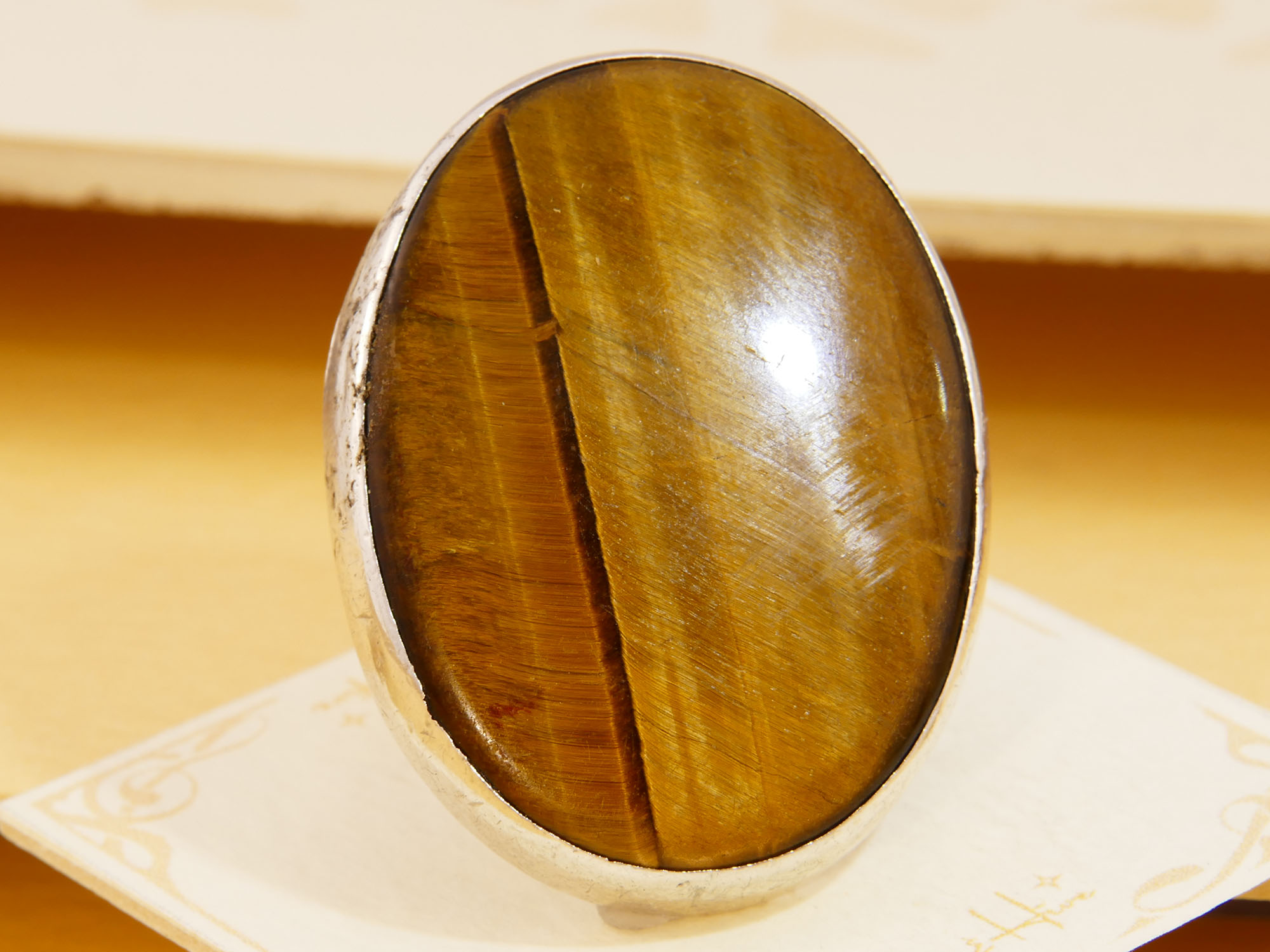 The Tigers Eye is impressively smooth with strong golden-brown chatoyancy that flashes in daylight. Its surface is tactile, showing signs of gentle rubbing from over five decades of wear. Measuring over 4cm in length, it makes a striking presence on the hand.