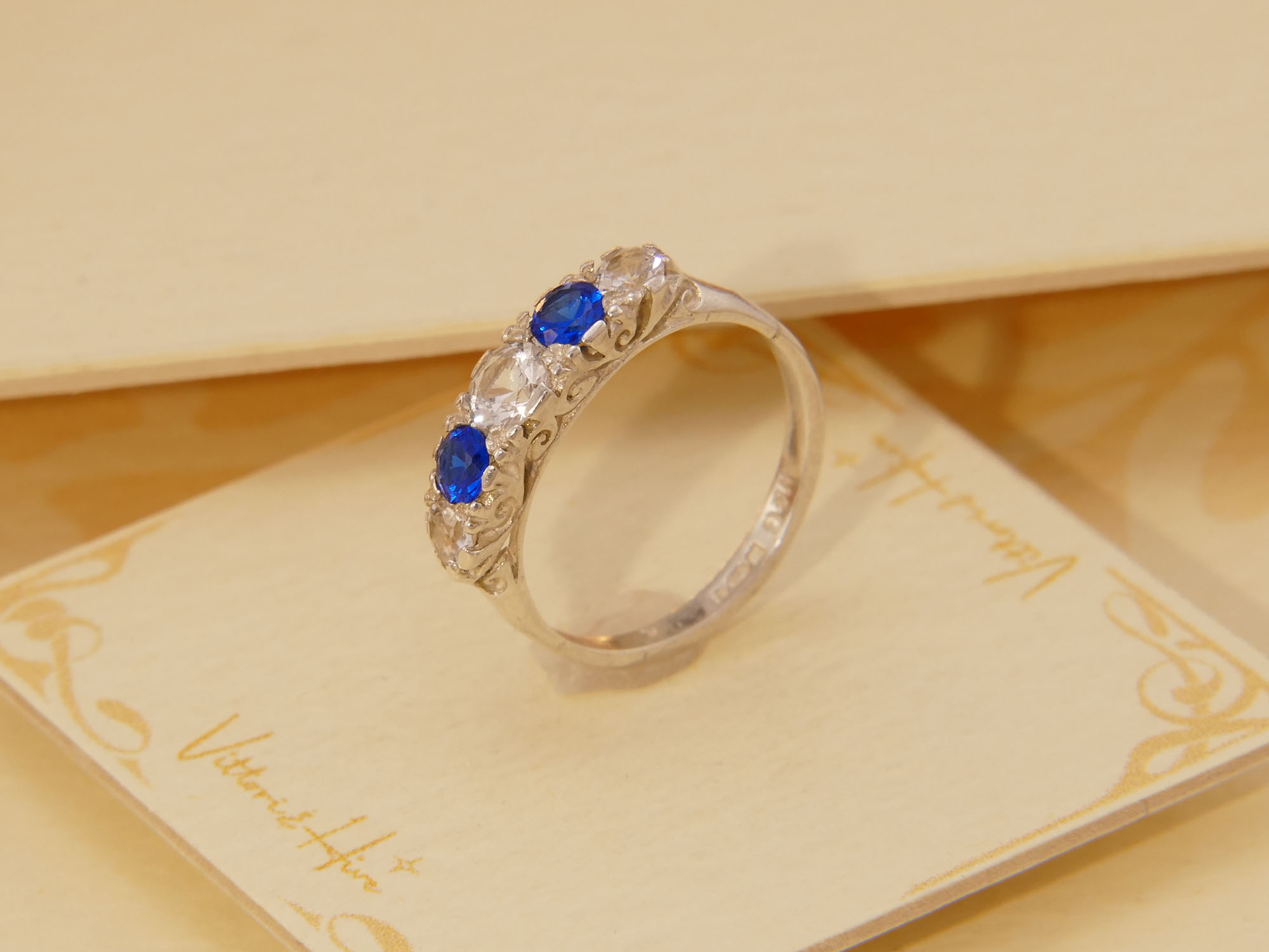 The two vivid blue spinel (3.9mm) sit between three clear spinel (centre stone 4.2mm, side stones 3.7mm), all round cut and securely claw set. The scroll detailing adds vintage charm without overwhelming the timeless silhouette.